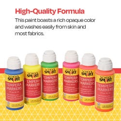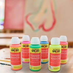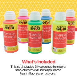 School Smart tempera paint daubers come in neon colors and refillable plastic squeeze bottles. Each dauber has a 2 ounce capacity. Our non-toxic, water-soluble tempera poster markers feature a 3/8 inch dauber applicator tip for a non-messy and smooth application. This poster paint marker set includes 6 daubers. The squeeze bottle tempera paints are freeze/thaw stable.Features