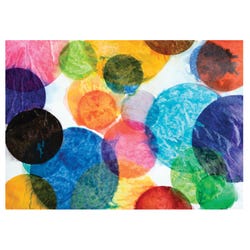 Create fun designs with Spectra Deluxe Bleeding Art Tissue! Wet with a brush and wash beautiful, translucent color onto the paper. Overlap two colors and watch them blend. Or, add glue to the water to hold specific shapes in place and create magnificent, multi-layered effects. The Bleeding Tissue Circles Assortment is available in 25 assorted colors, including Cerise, National Blue, Chinese Red, Blush Pink, French Blue, Spring Green, Dark Pink, Scarlet, Magenta, Sky Blue, Leaf Green, Canary, National Red, Orchid, Azure Blue, Seal Brown, Goldenrod, Purple, Emerald Green, Black, Orange, Baby Pink, Medium Blue, Apple Green and White. This high-quality tissue can withstand cutting, crinkling and folding without tearing. The assortment includes 750 each of 3 different sizes: 1-1/2, 2-1/2 and 4 inch circles.Features