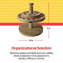 Create your best crafting space with the School Smart wooden scissors stand. This stand can efficiently hold up to 24 pairs of scissors. Place it on a desk, cabinet, stand, counter, or wherever you like to cut and craft. Our scissor stand is great for schools, art studios, and homes. The scissor caddy measures 9 inches high and 8-1/2 inches in diameter.