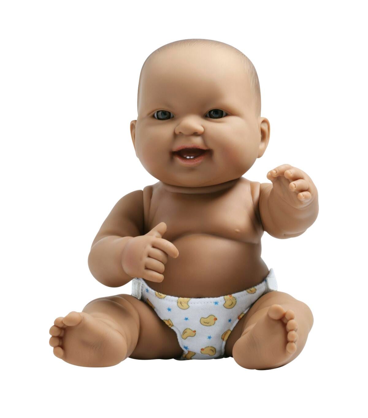 Spread the smiles around with this Lots to Love Baby! The adorable chubby infant doll is made from durable vinyl with movable arms, legs, and head, as well as an animated facial expression. Comes with a washable, reusable diaper with hook and loop tabs for easy pull-up and down. Each baby doll may vary in facial expression and eye color.Features