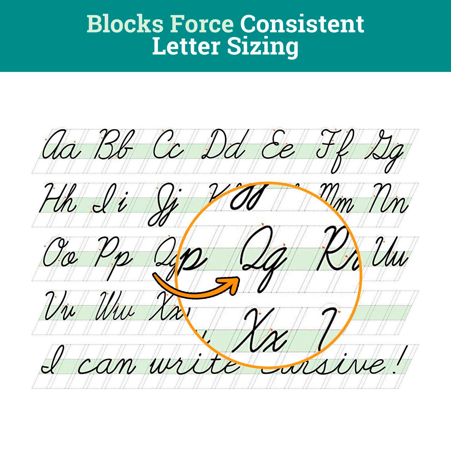 - Slanted Blocks, Green Shade, and Visual Spacing Lines Help Guide Kids to Write with a Slant, Use Proper Spacing, and Maintain Consistent and Proper Cursive Letter Size