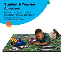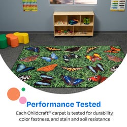 Childcraft® PhotoFun Butterfly Seating Carpet is comfortable, durable, and rectangle-shaped. Perfect for group activities, morning attendance, reading, and playtime, the classroom carpet features realistic 3D grass blades and beautiful butterflies to mark sitting areas. A colorful design adds a touch of fun to any room whether at school or at a childcare center. Our soft indoor carpet is made of high-quality materials for long-lasting use. Each Childcraft carpet is performance tested for durability, color fastness, and stain and soil resistance for quality you can trust.Features