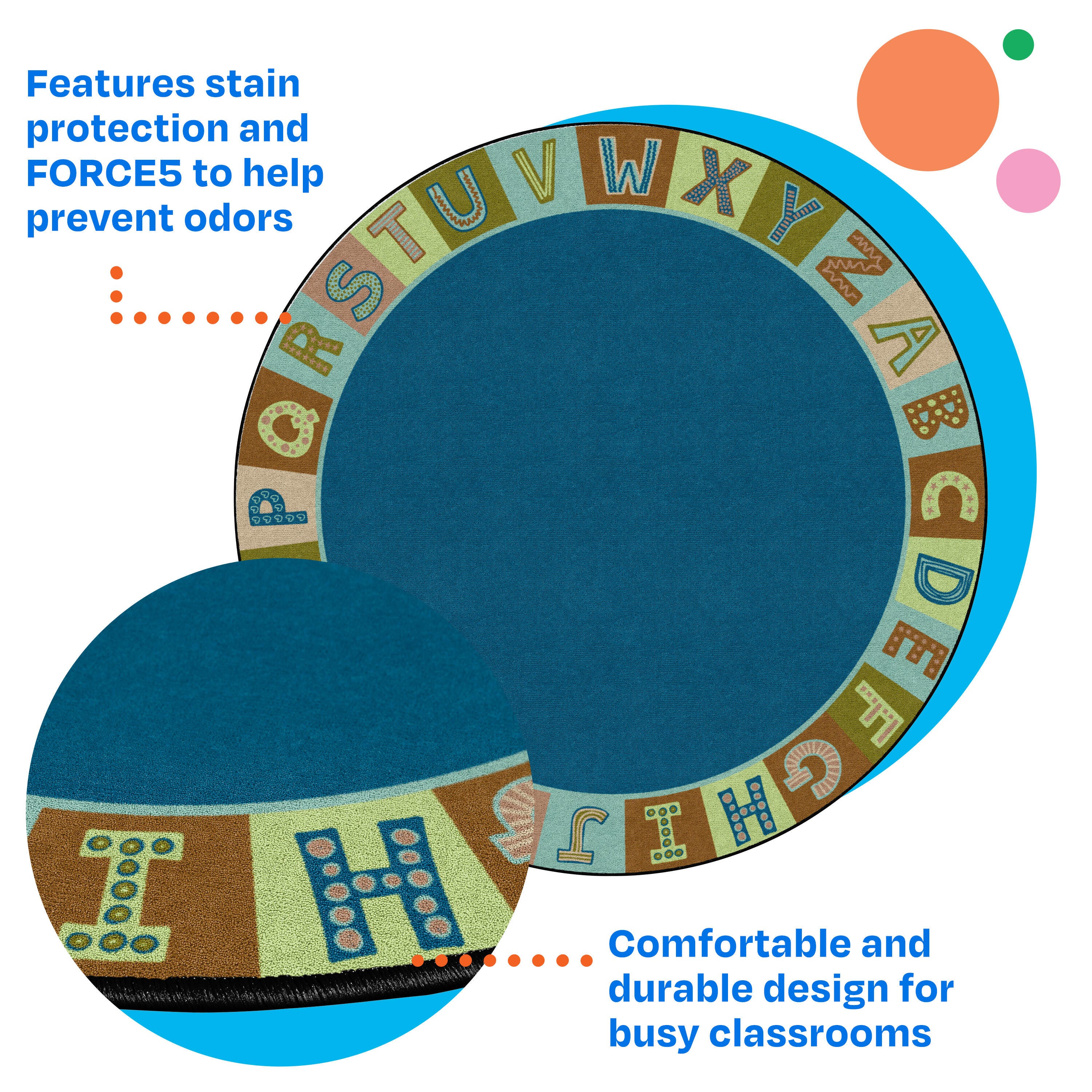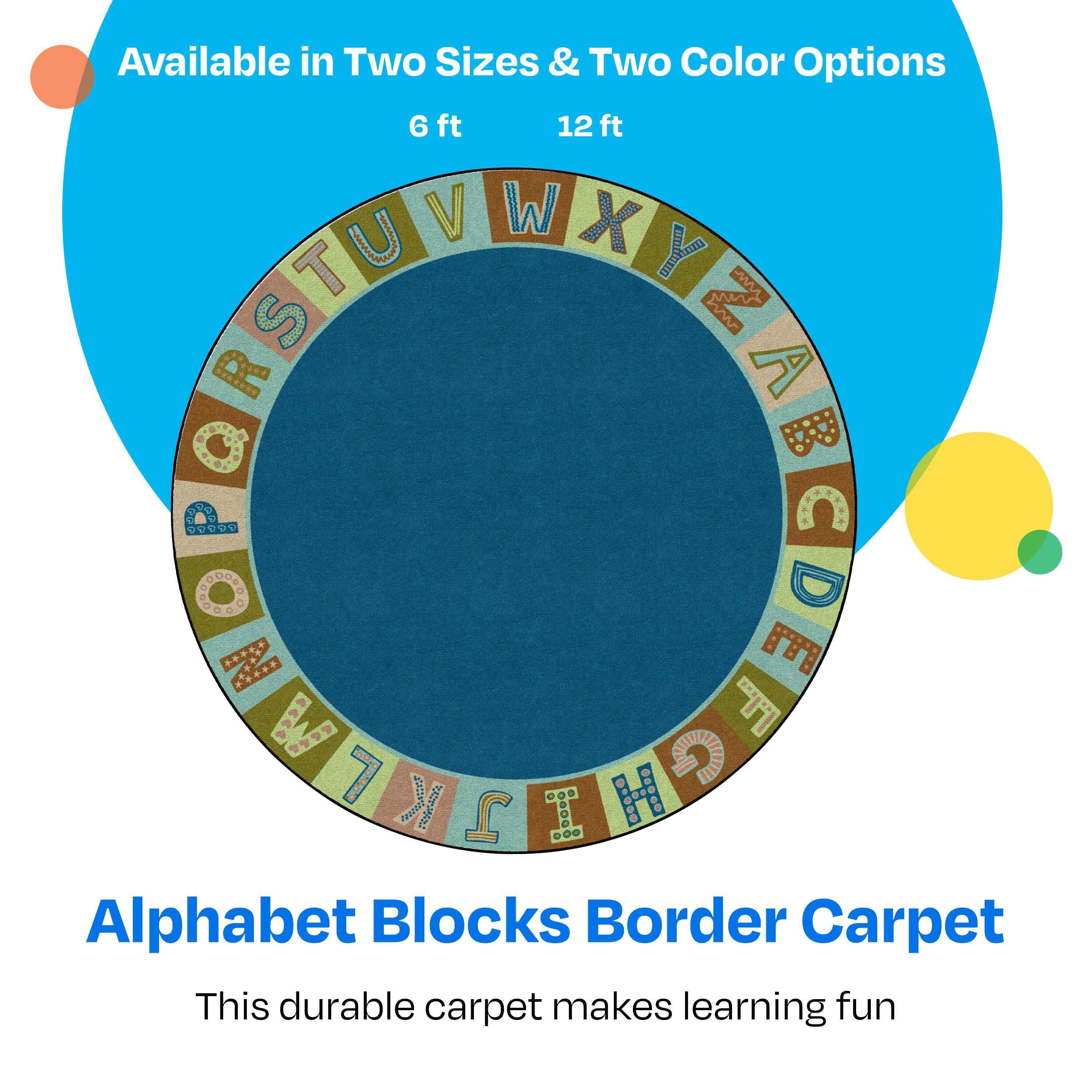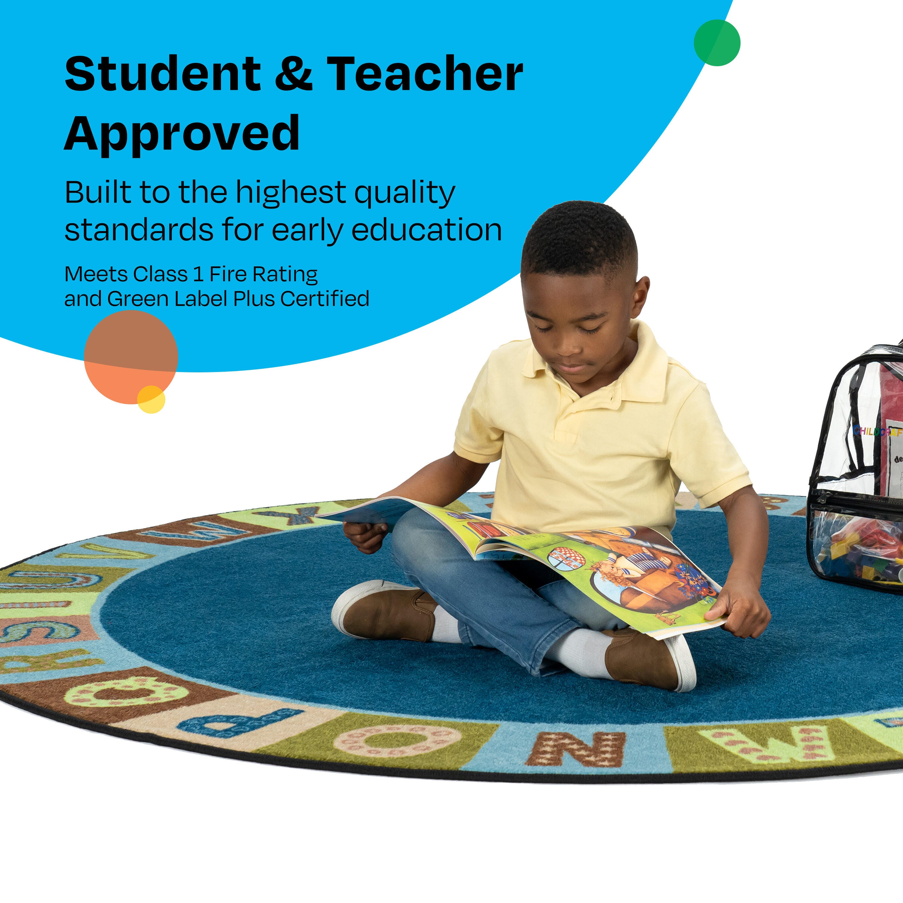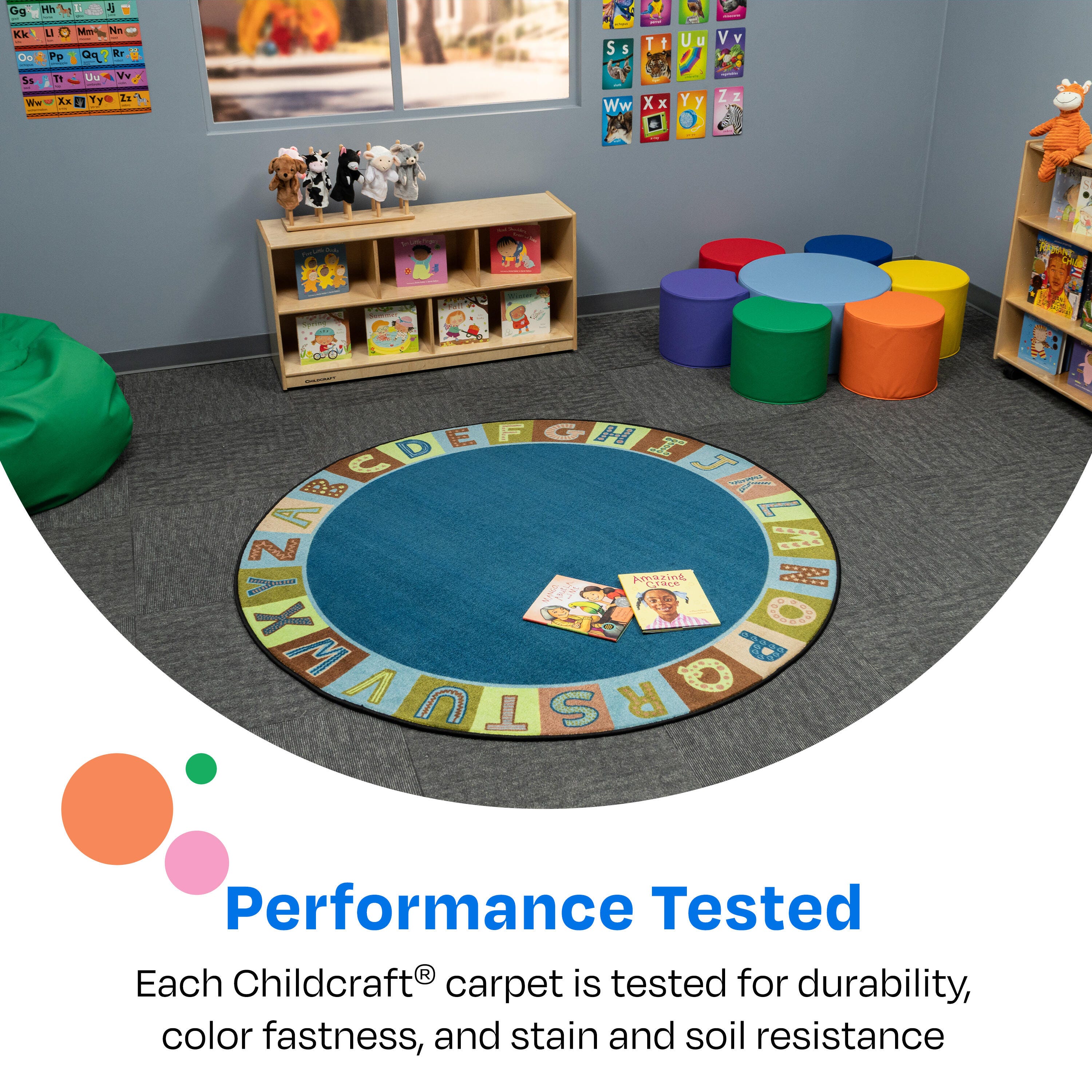 This Childcraft® Alphabet Blocks Border Carpet comes in a round shape and convenient size for early learners. Ideal for encouraging letter recognition, circle time, and group gatherings, the colorful ABC carpet features images of blocks and letters from A to Z. Our alphabet carpet is made of high-quality materials to create a comfortable and durable space for sitting. Each Childcraft® carpet is performance tested for durability, color fastness, and stain and soil resistance for quality you can trust. The Green Label Plus Certification also helps ensure the best indoor quality for a safe and healthy environment all year long. Please Note: Childcraft® carpets are custom designs that are made to order and are therefore non-returnable.
