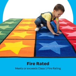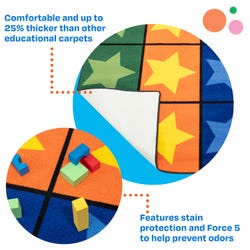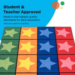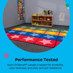 Every child will feel like a star from their own spot on this brightly-colored classroom rug. Horizontal rows feature 30 colorful stars within square sections for story time seating or other group activities. Childcraft carpets are performance tested for durability, color fastness, and stain and soil resistance for quality you can trust. Because of its versatility, this carpet can be used as a playroom rug, a preschool rug, a childcare center rug, a reading rug, or simply as the perfect rectangle carpet to match your space. This area rug is Green Label Plus Certified, meaning it promotes the best indoor air quality for a safe and healthy environment all year long. When ordering, choose the size that best fits your space. durability, color fastness, and stain and soil resistance for quality you can trust. Available in several colors and sizes. Please select which fits best when ordering.Features