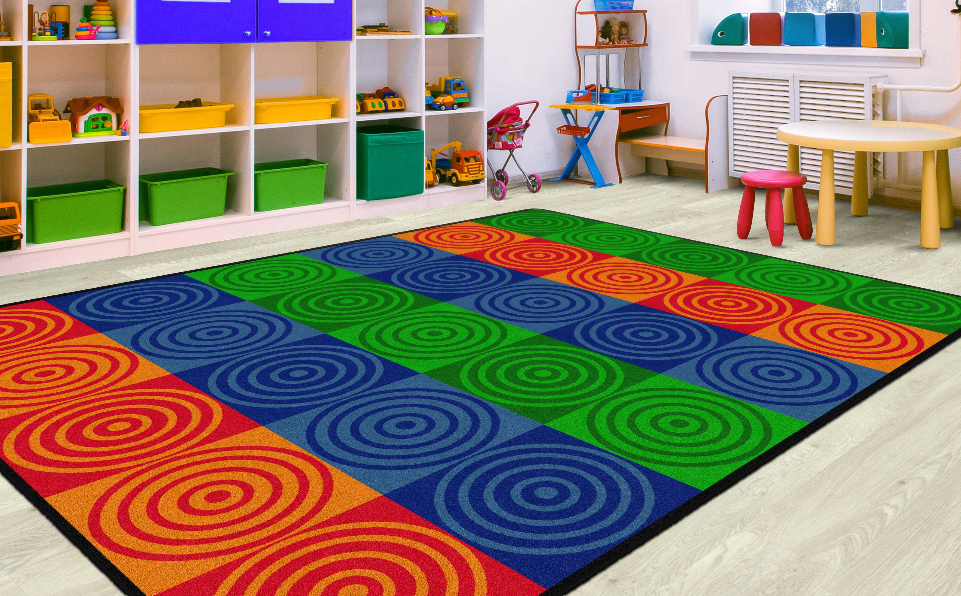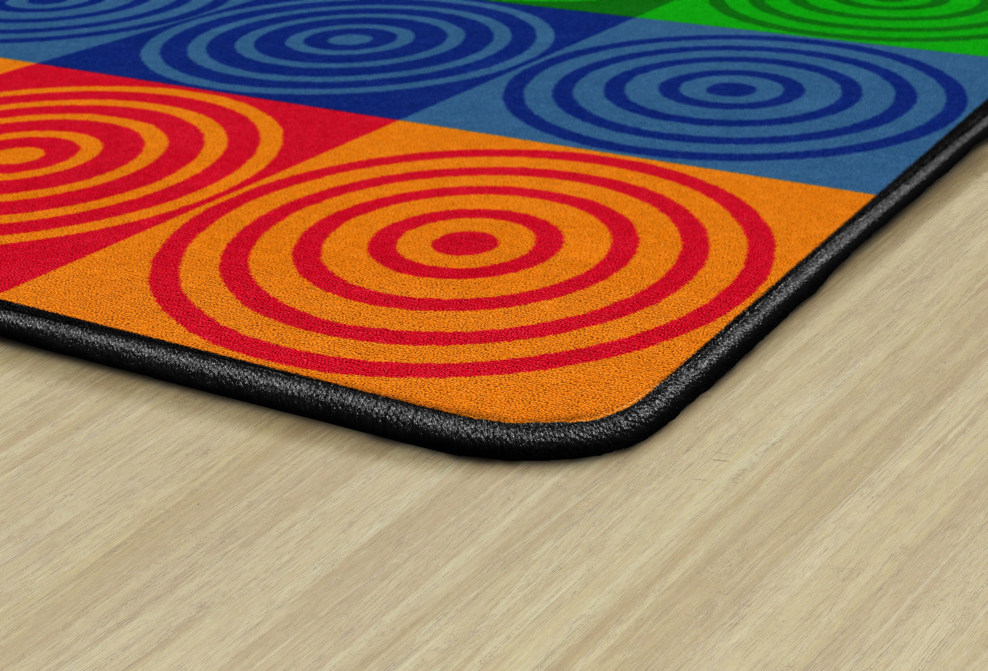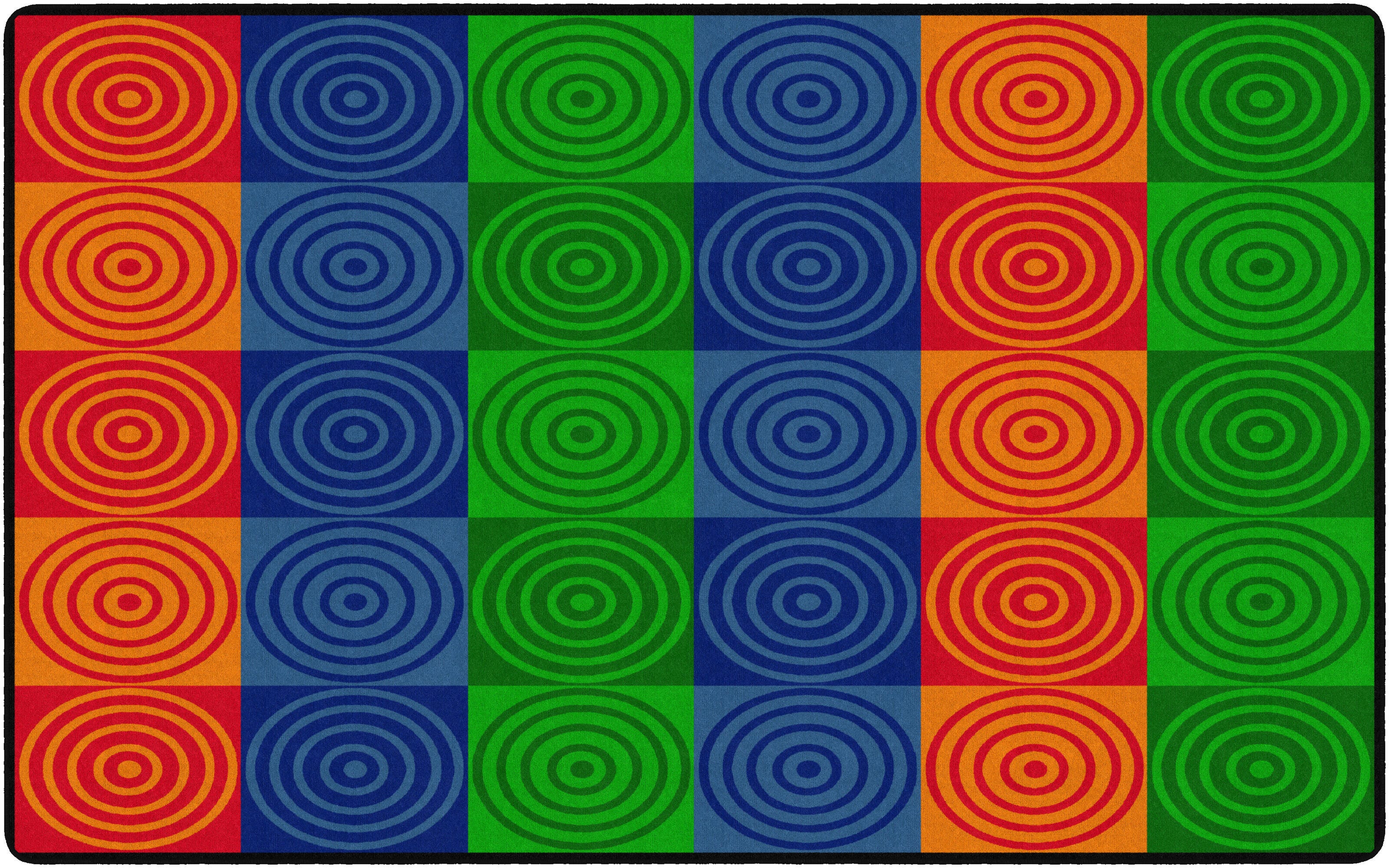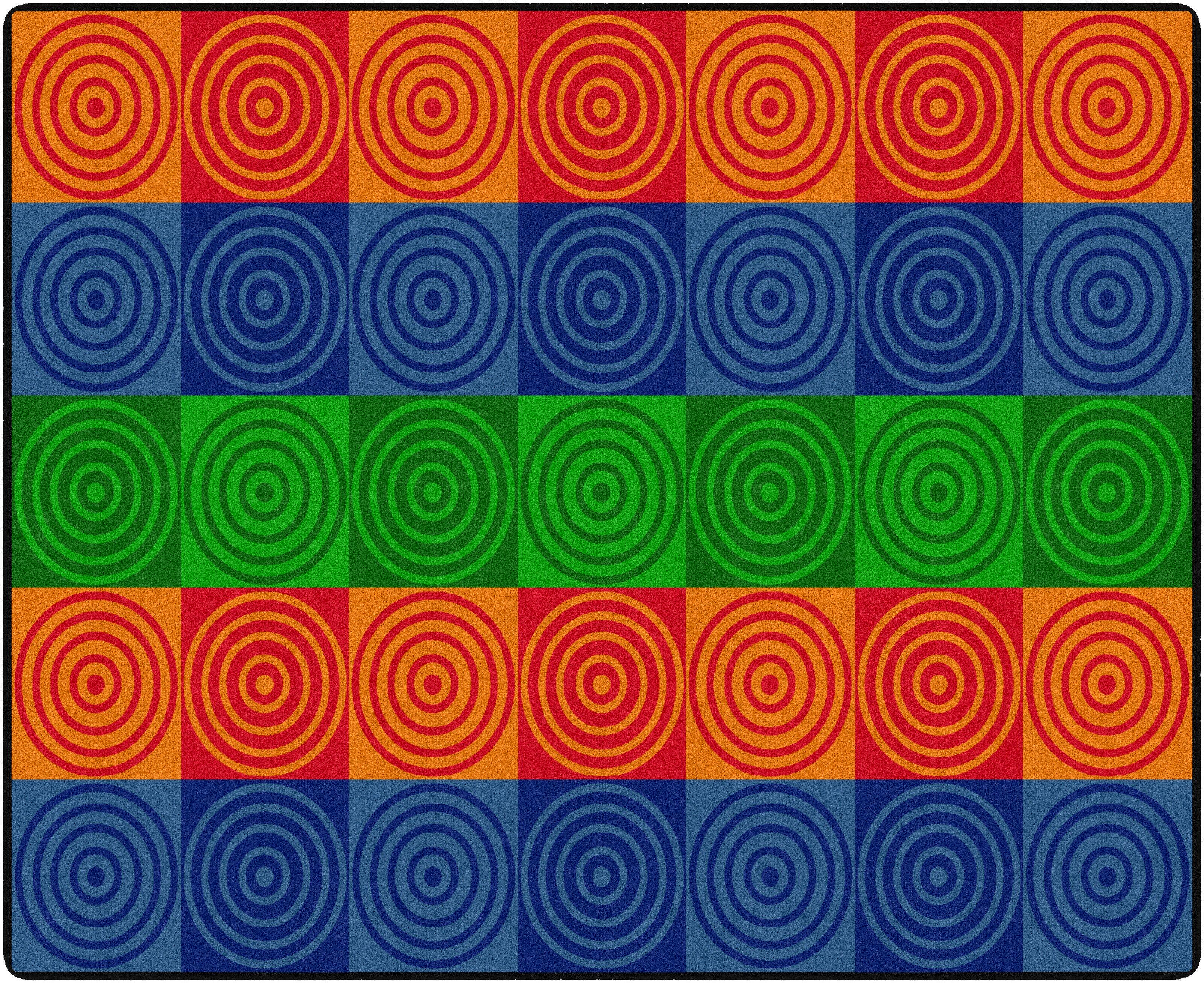 Description Flagship Carpets Bullseye Block Rectangle Carpet gives every student a place to sit on this colorful seating carpet. This area rug makes finding your spot simple, and contrasting bullseye patterns help each student easily identify their space. This floor covering is designed in color blocks for easy group organization. Perfect for spaces where young children gather - the playroom, childcare center, classroom, or preschool. Seats up to 24 students. Washable carpets feature skid-resistant backing to prevent slips and trips, and are treated with SCOTCHGARD-PROTECTOR for superior soil resistance and FORCE 5, a permanent anti-microbial agent to guard against odor, mildew, and mold. All Flagship Carpets are CRI Green Label Plus Certified. Backing contains synthetic (SBR) latex for those with latex allergies. Rectangle carpet available in several sizes to match your space.Features Treated with SCOTCHGARD-PROTECTOR for superior soil resistance Treated with FORCE 5 to guard against odor, mildew and mold Made with 100% nylon for an environmentally conscious yet durable design CRI Green Label Plus Certified to promote a non-toxic learning environment