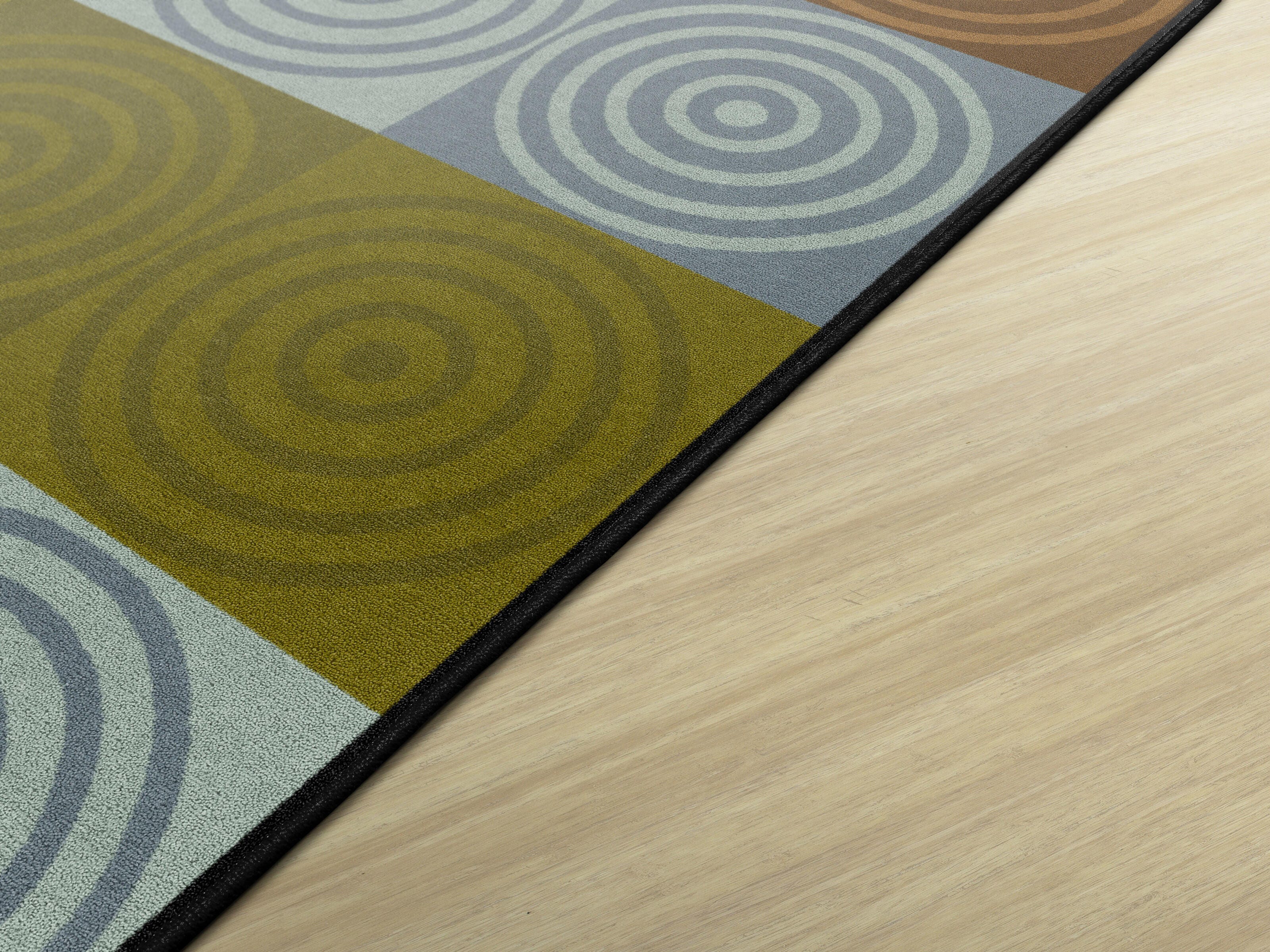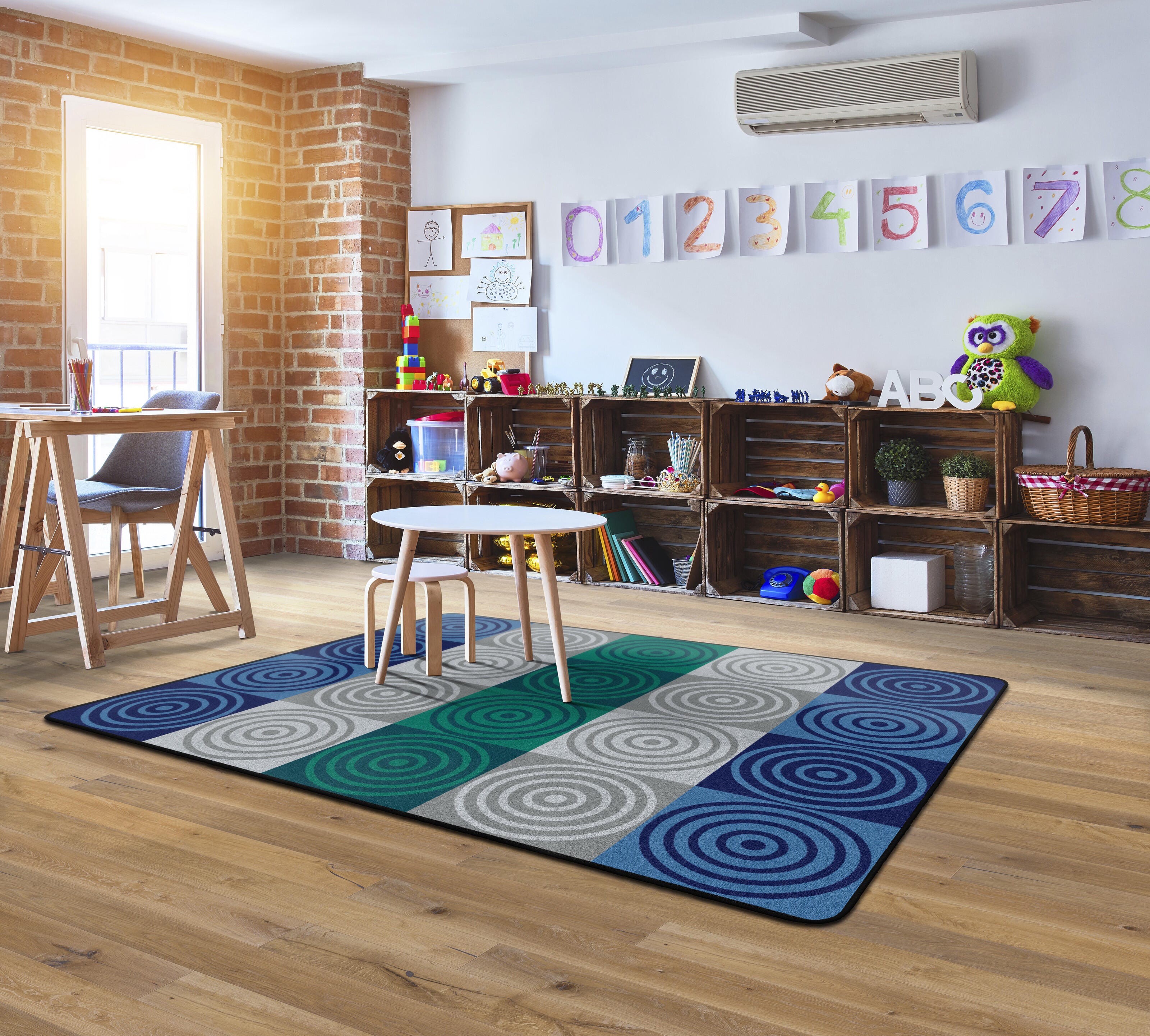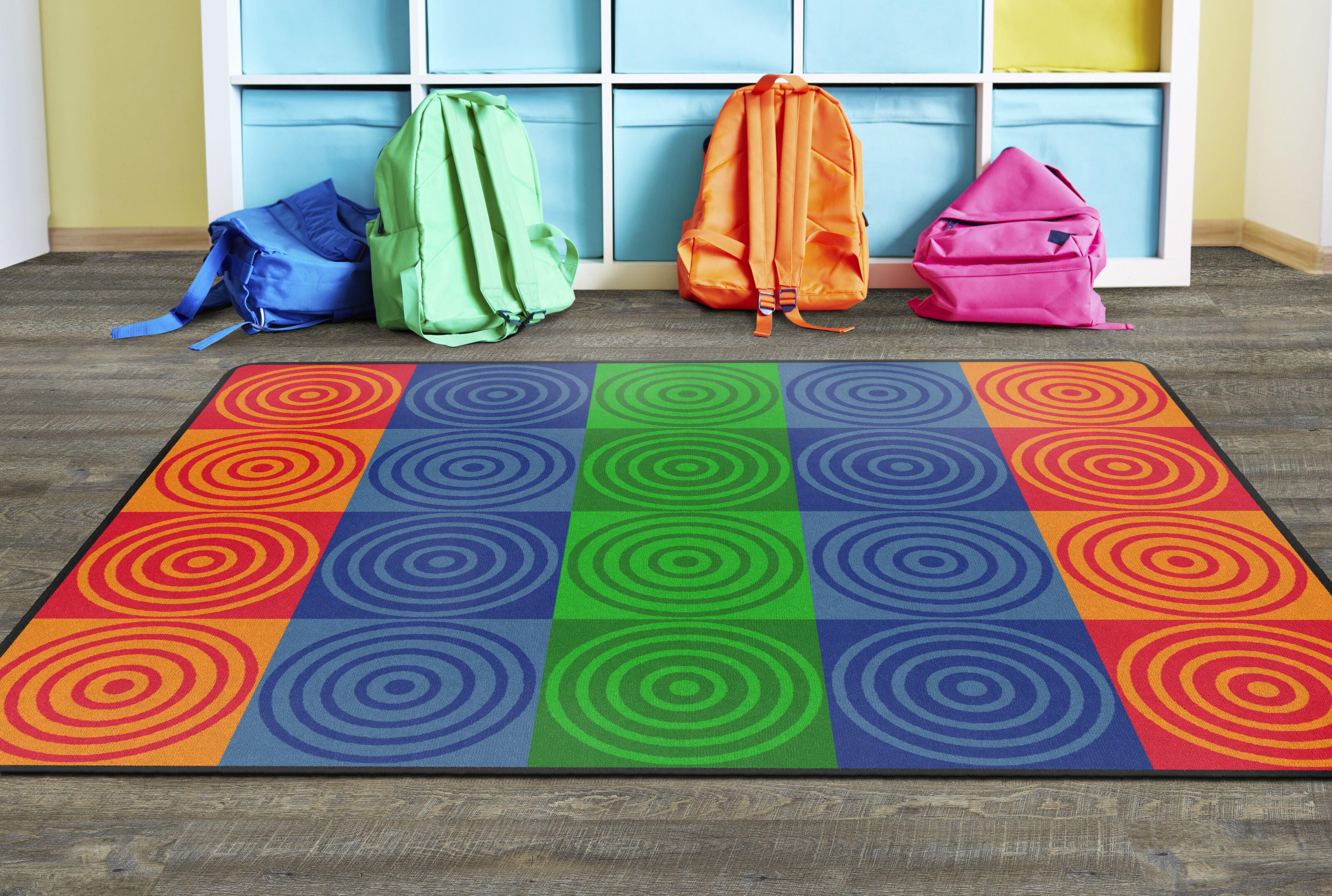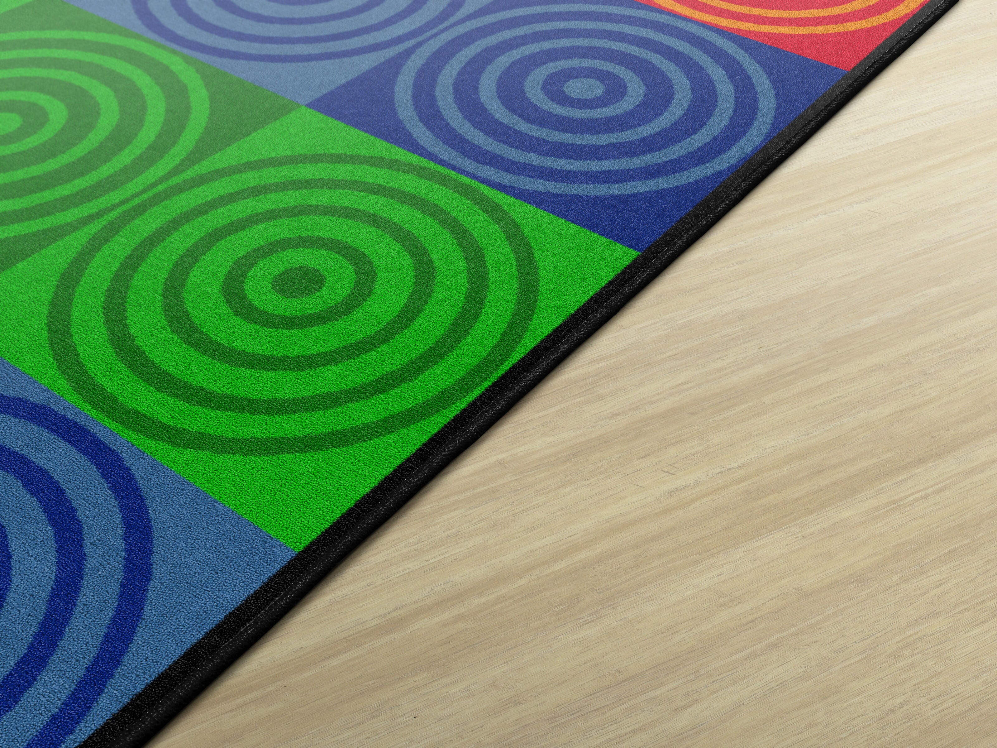 Description Flagship Carpets Bullseye Block Rectangle Carpet gives every student a place to sit on this colorful seating carpet. This area rug makes finding your spot simple, and contrasting bullseye patterns help each student easily identify their space. This floor covering is designed in color blocks for easy group organization. Perfect for spaces where young children gather - the playroom, childcare center, classroom, or preschool. Seats up to 24 students. Washable carpets feature skid-resistant backing to prevent slips and trips, and are treated with SCOTCHGARD-PROTECTOR for superior soil resistance and FORCE 5, a permanent anti-microbial agent to guard against odor, mildew, and mold. All Flagship Carpets are CRI Green Label Plus Certified. Backing contains synthetic (SBR) latex for those with latex allergies. Rectangle carpet available in several sizes to match your space.Features Treated with SCOTCHGARD-PROTECTOR for superior soil resistance Treated with FORCE 5 to guard against odor, mildew and mold Made with 100% nylon for an environmentally conscious yet durable design CRI Green Label Plus Certified to promote a non-toxic learning environment