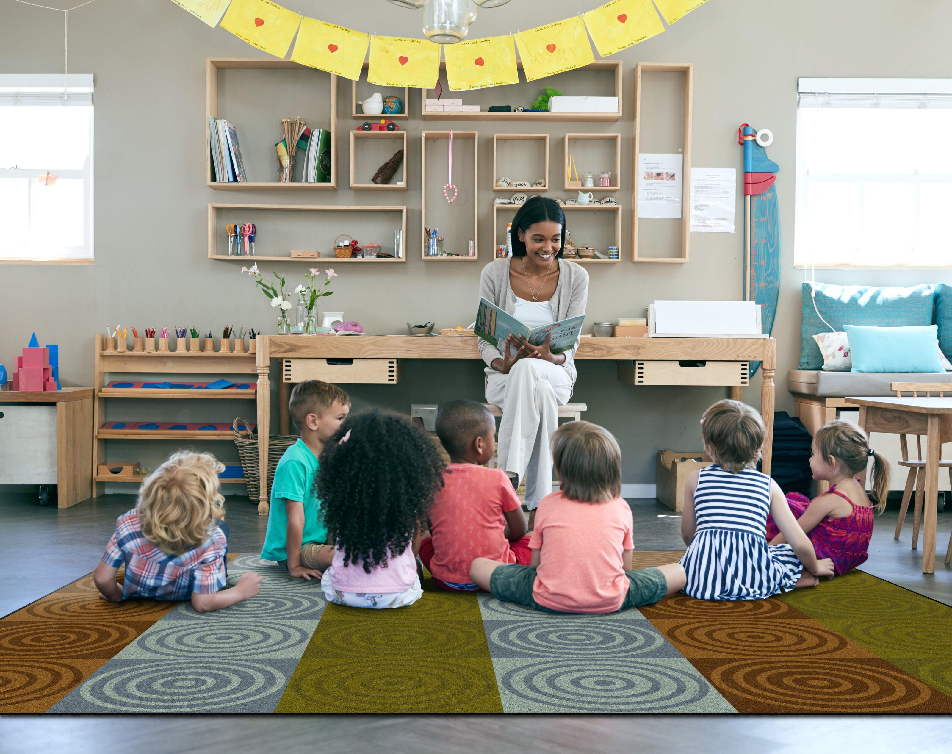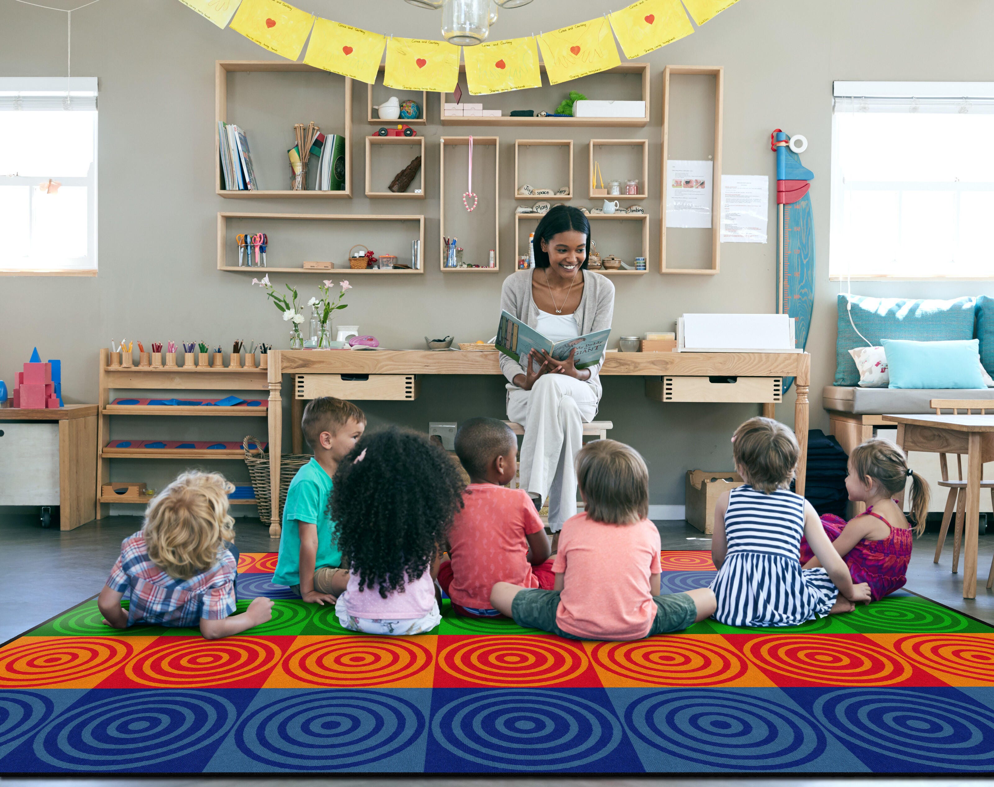 Bullseye! Children will have fun on this colorful classroom carpet with seating blocks, designed with a subtle, color-contrasted bullseye right where they sit. This rectangle rug seats up to 24 and is available in several sizes.