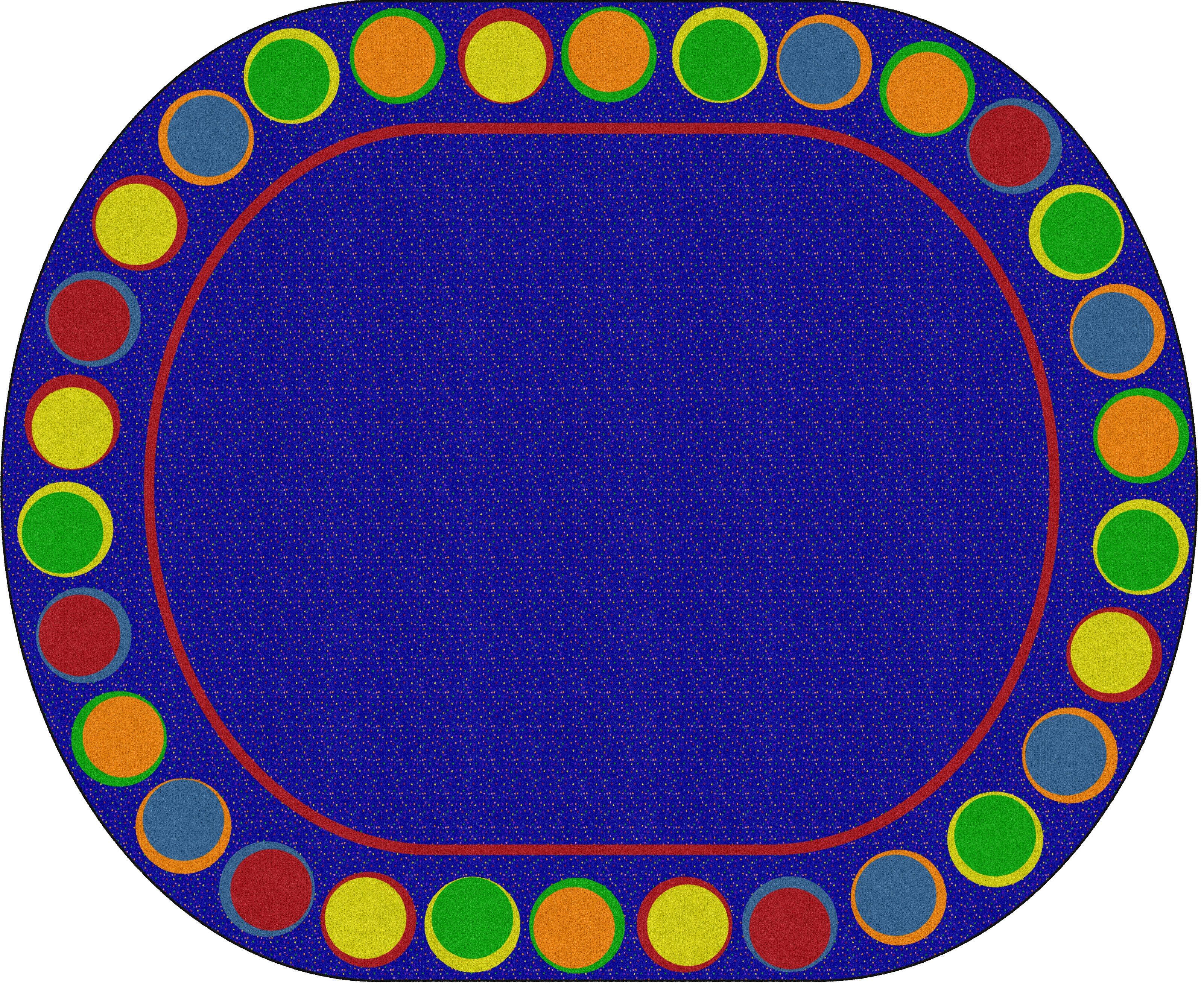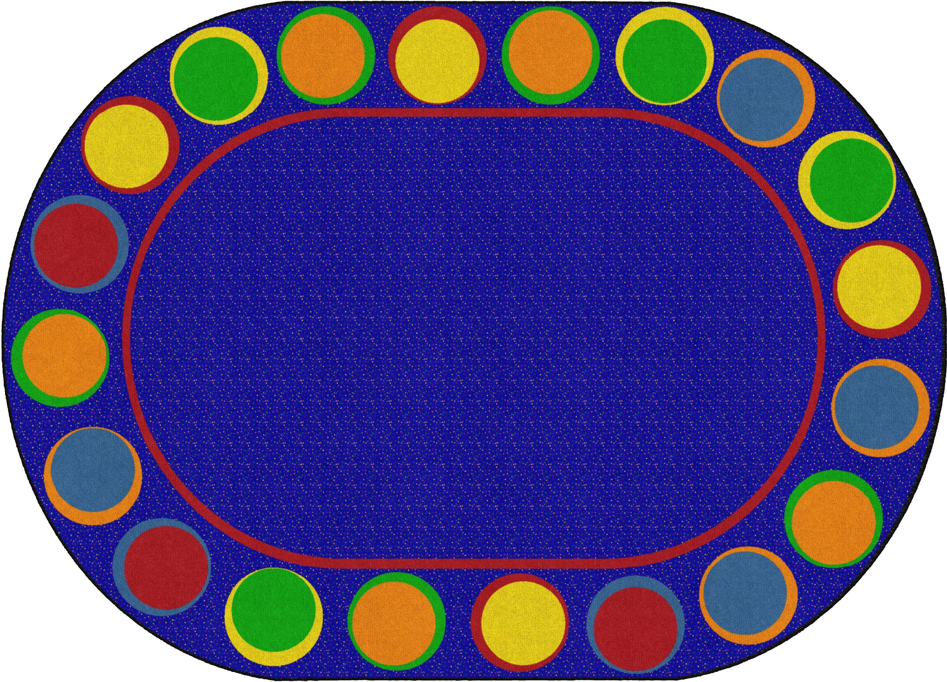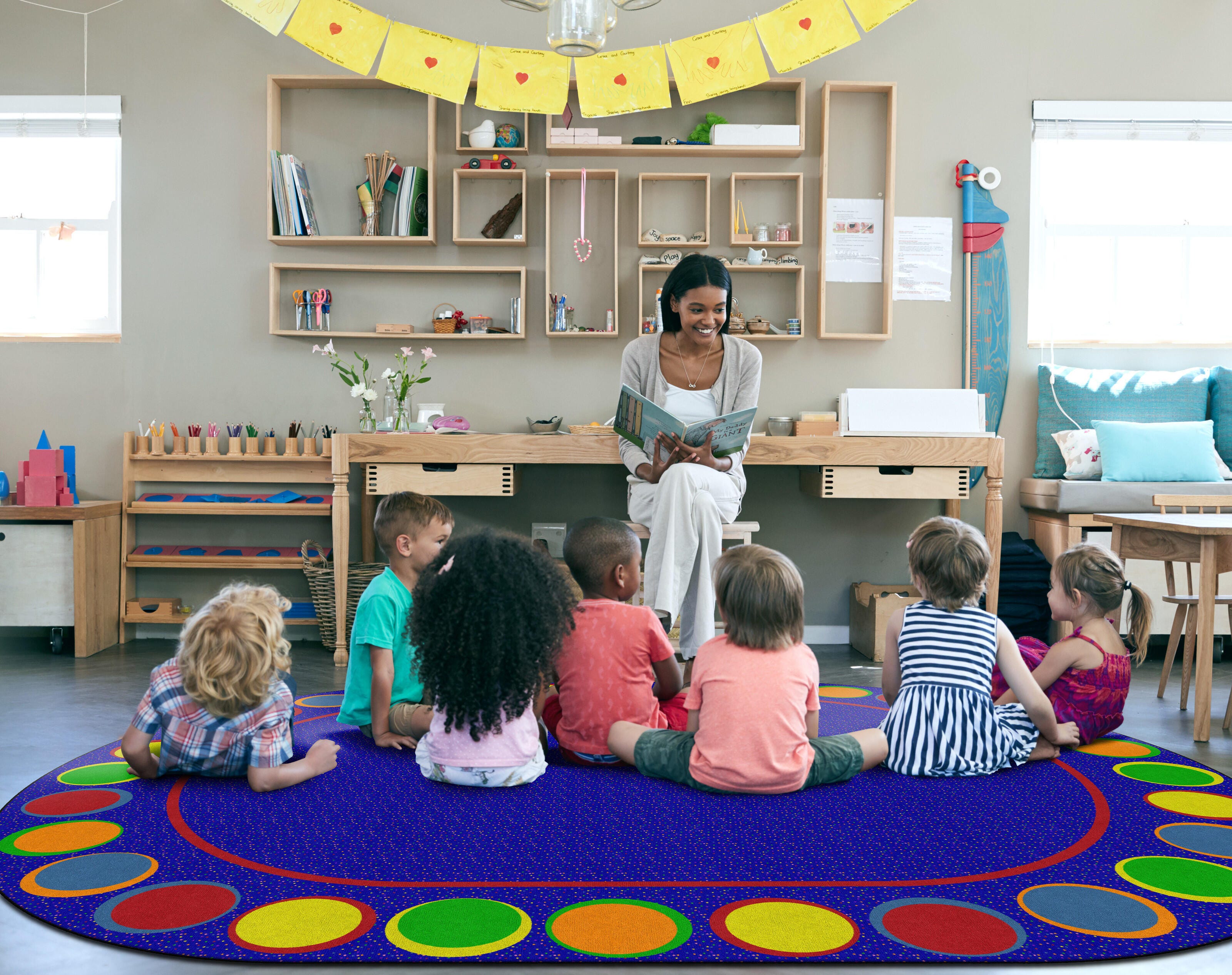 Flagship Carpets Sitting Spot Carpet is an ideal gathering place for circle time, show-and-tell, storytime, and more! It offers 24 spots that allow for comfortable space for everyone. This colorful area rug is constructed of dense nylon fiber and treated with Scotchguard stain protection. The edges are tightly bound and double-stitched for maximum strength, and the skid-resistant Action Bac woven backing system prevents wrinkles and bunching so it provides long-lasting use. A permanent antimicrobial treatment protects against odors, mold, and mildew to keep it safe and clean in any classroom, preschool, childcare center, or home.