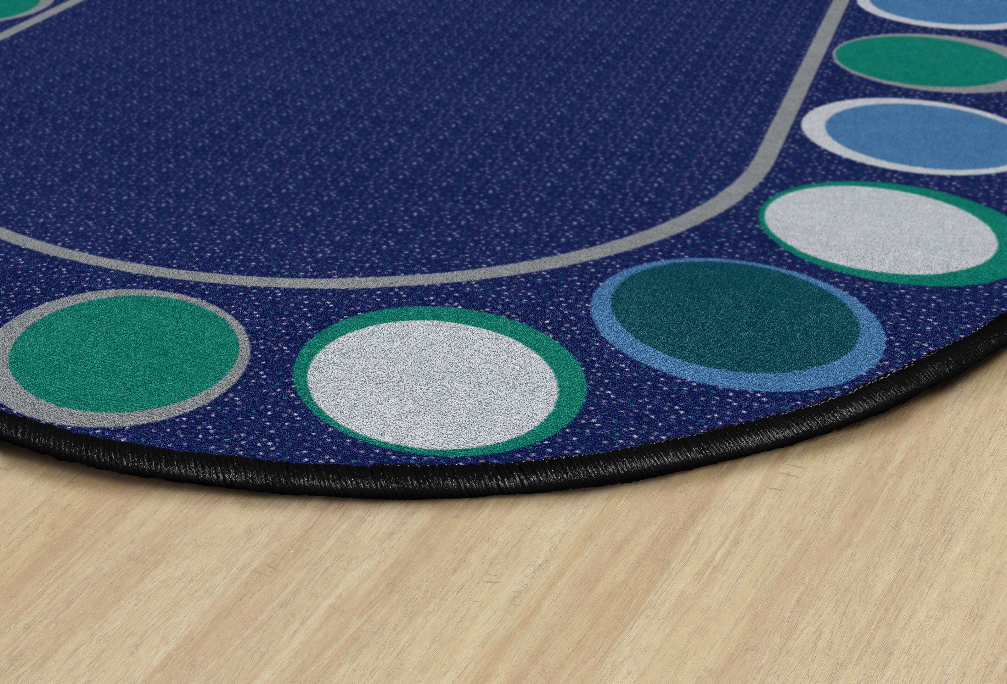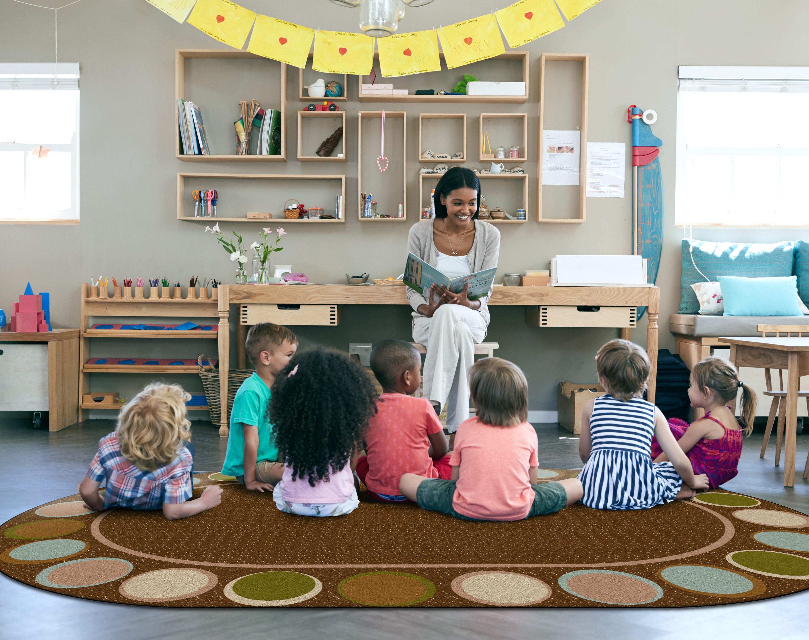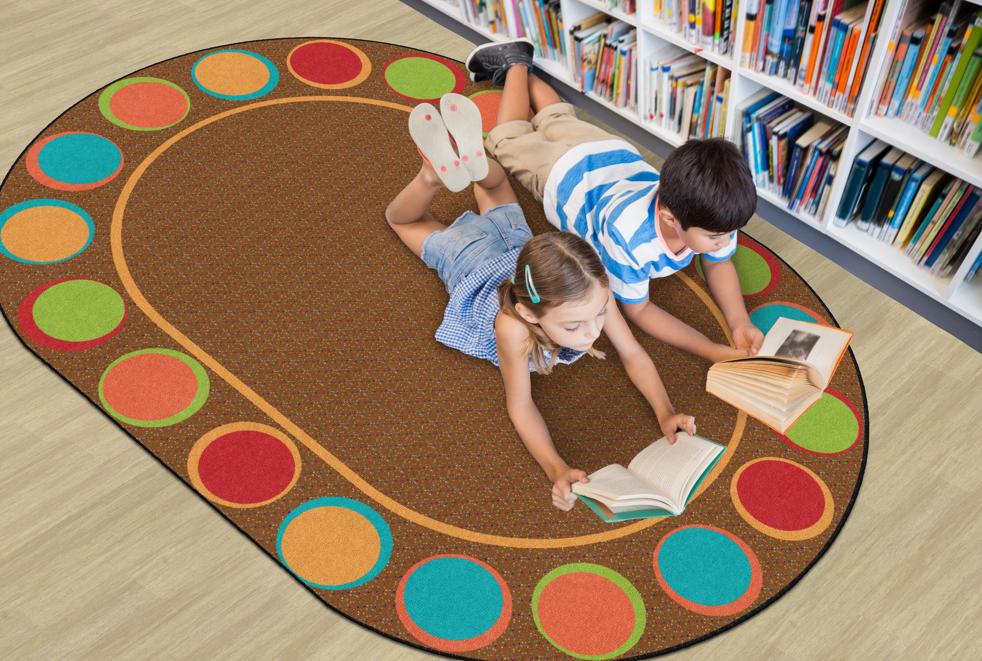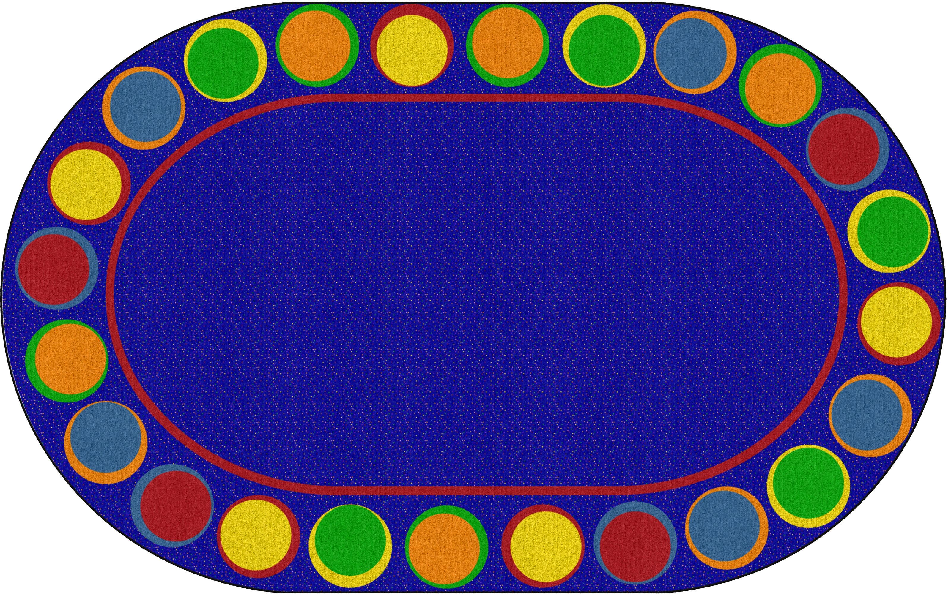 Flagship Carpets Sitting Spot Carpet is an ideal gathering place for circle time, show-and-tell, storytime, and more! It offers 24 spots that allow for comfortable space for everyone. This colorful area rug is constructed of dense nylon fiber and treated with Scotchguard stain protection. The edges are tightly bound and double-stitched for maximum strength, and the skid-resistant Action Bac woven backing system prevents wrinkles and bunching so it provides long-lasting use. A permanent antimicrobial treatment protects against odors, mold, and mildew to keep it safe and clean in any classroom, preschool, childcare center, or home.