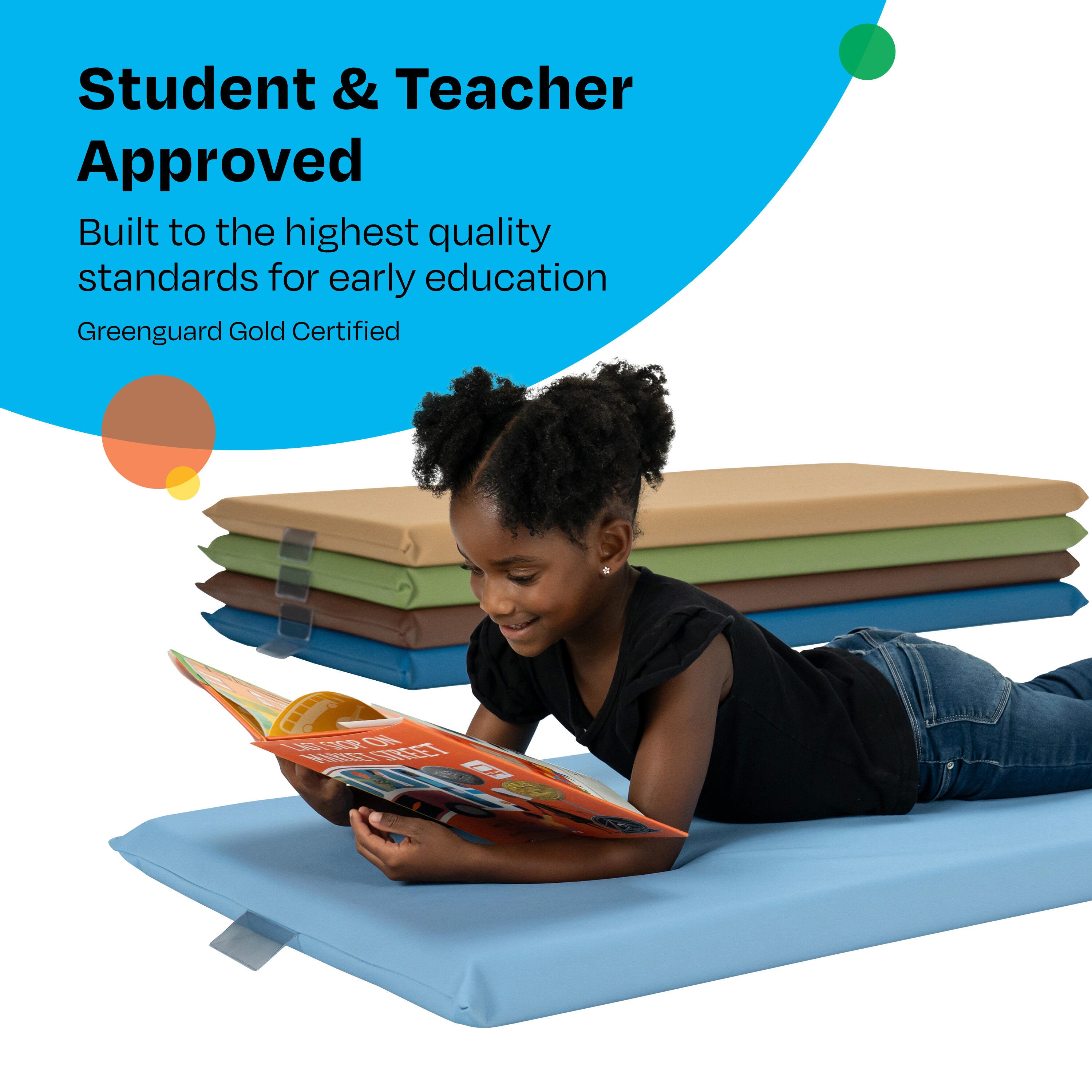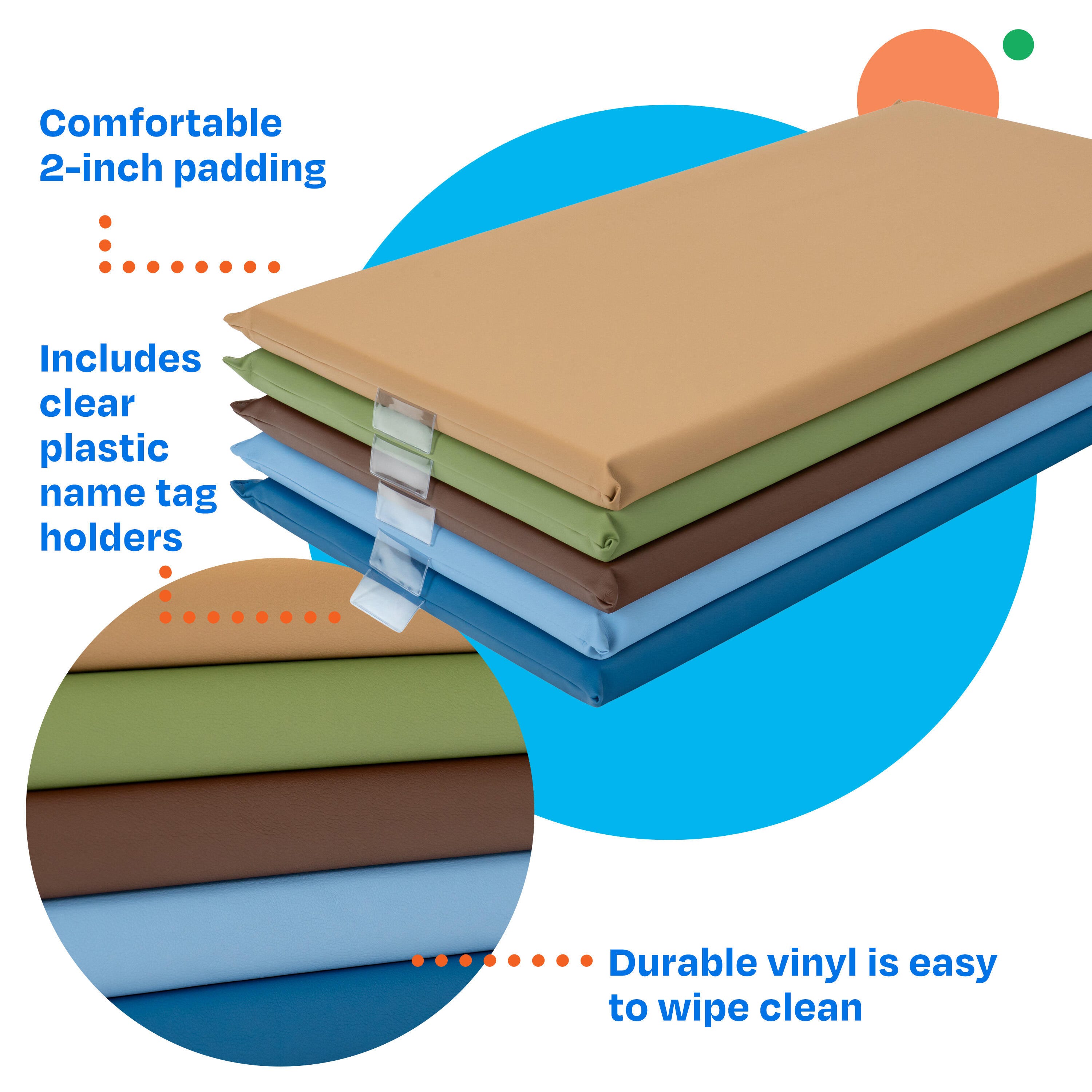 Childcraft® Rainbow Rest Mats for classrooms are the perfect solution for naptime and relaxation. Each mat is padded and easy to wipe clean, combining comfort and durability for students and teachers. The sleeping mat is made using radio frequency vinyl welding technology to seal all seams and protect the foam padding from liquid and bacteria. Wipe clean to disinfect after each use. This set includes 5 fun colors in earthtone shades of brown, blue, and green. Each sleeping pad includes a clear nametag holder and is lightweight and simple to take out/put away. Measures 48 L x 24 W x 2 H inches and comes in a pack of 5.Features