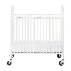 The quality and durability of steel ensures your investment will last. Our folding cribs feature easy-to-clean finish, 360˚ welding process that provides added strength, and 4" casters that allow cribs to be used for evacuation. Folds flat in seconds for easy storage. Mattress included. Crib measures 40 L x 28 W x 43 H inches.