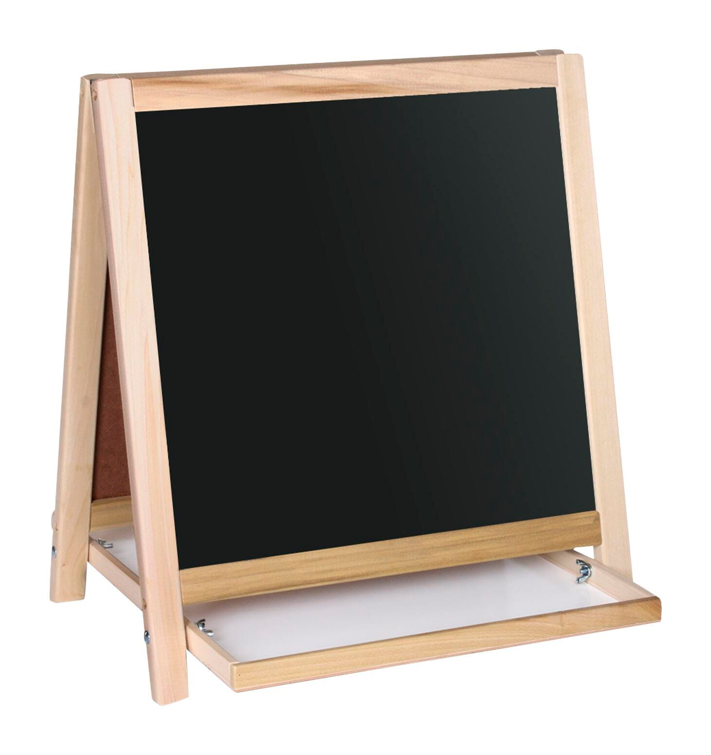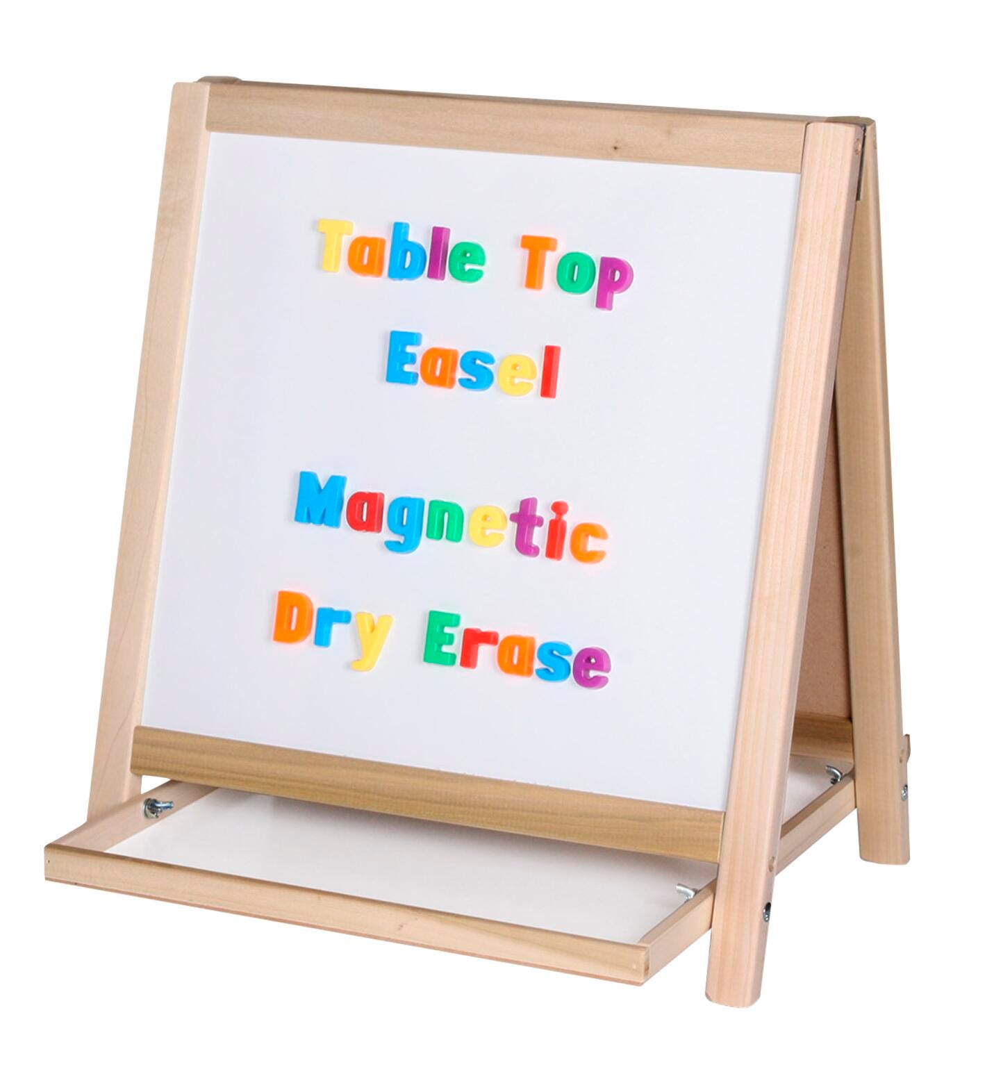 Magnetic Table Top Easel is designed for table top use. This framed wooden easel features a white magnetic dry-erase surface on one side and a green chalkboard on the reverse.