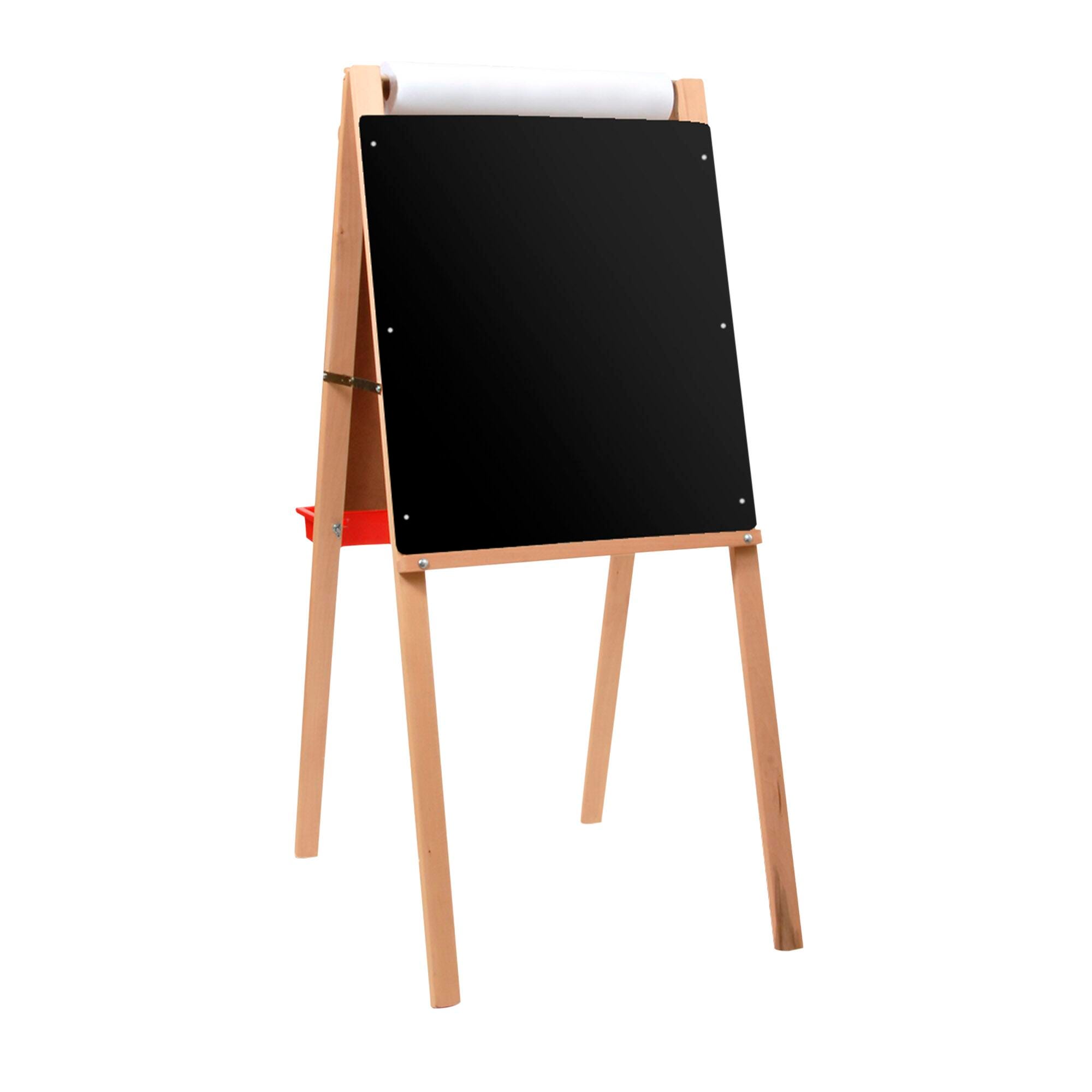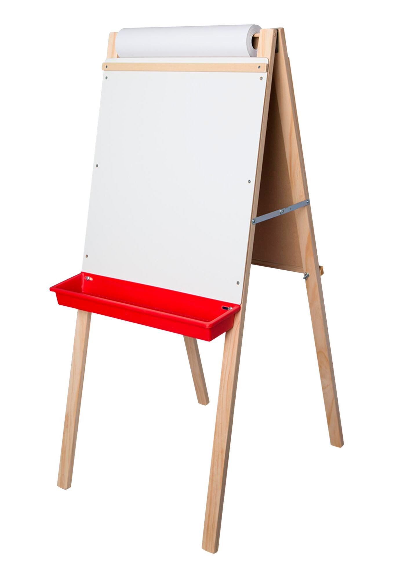 Designed for children under the age of 6, this easel features a lead-free chalkboard on one side, a white dry-erase board on the reverse, and a 15 inch x 100 foot paper roll on the top. Side brackets are finger friendly and fold easily for storage. One durable tray is included for storing paint, markers, and supplies. Solid wood construction.
