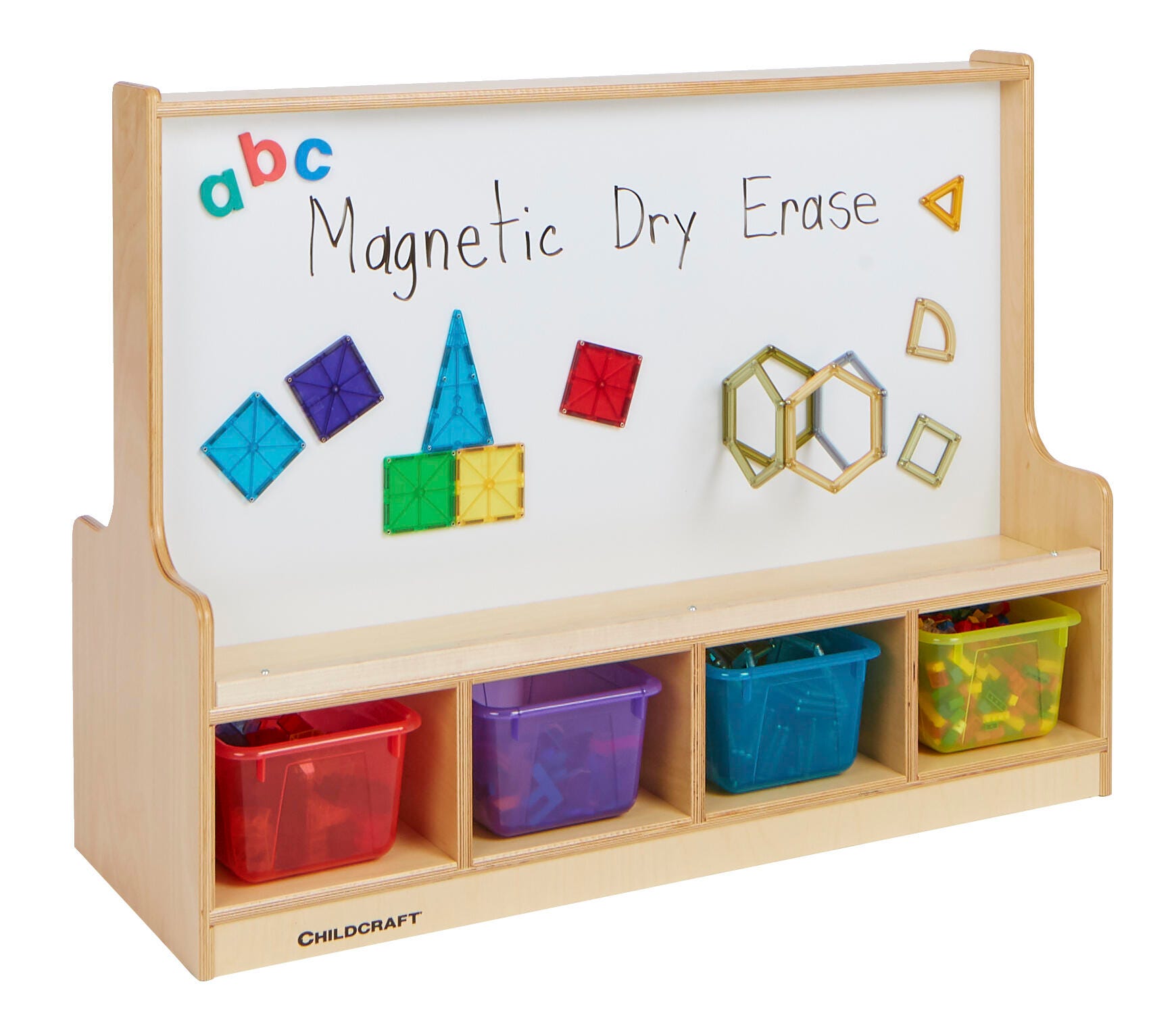 Childcraft® Dual-Sided Building-Brick Activity Center offers a perfect blend of entertainment and organization for children. One side features a multi-colored brick grid for standard-sized building blocks, while the other side provides a magnetic dry erase board for drawing, writing, and problem-solving. The play unit includes four removable translucent-colored trays for convenient storage of bricks, markers, or other supplies. This activity center promotes teamwork and creative exploration, making it ideal for classrooms, daycares, or playrooms. Comes fully assembled. The compact activity wall measures 39-1/2 W x 14-1/4 D x 30 H inches.Features