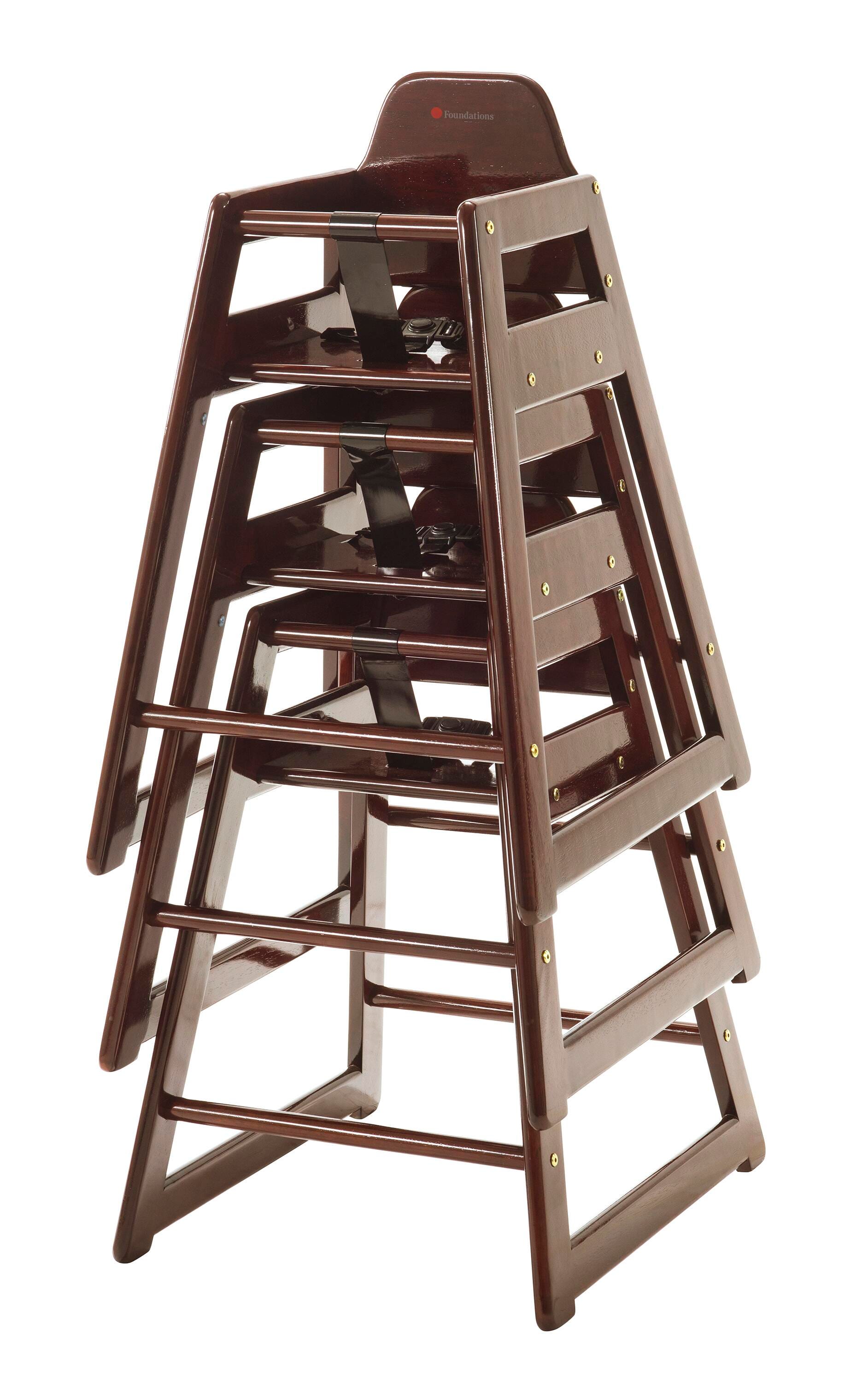 Durable solid-hardwood construction. Rounded edges for safety and finished appearance. Wide base for added stablilty. Easy-to-clean, adjustable harness for added security. Replaceable passive, crotch restraint prevents slip through. Stackable up to four high to reduce storage space. Meets or exceeds the ASTM F404 safety standard.
