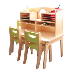 A uniquely styled desk that invites one or two children to sit down and read, write, draw, create, play or whatever the classroom activity entails. There's plenty of storage for papers, books or other materials and the colorful acrylic porthole inserts add a striking design element that also enable front to back supervision of children. The desk surface is 20-inches high and finished in kitchen-quality high pressure laminate (HPL) to resist scratches.Features