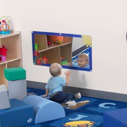 The Sunny Meadow Mirror provides a welcoming spot for facial recognition and discovery. This mirror is constructed of shatter-resistant acrylic to keep kids safe. The colorful border and flower and sun detail is printed on the back, so it won’t scratch off or chip. Mirror is designed to be displayed either vertically or horizontally. Mounting hardware not included. Dimensions: 36 in L x 18 in W x 1/16 in H. For ages 6 months - 2 years. Mirror (on longer wall) only.Features