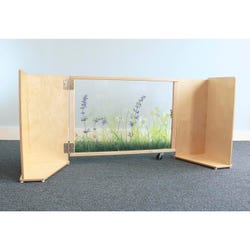 Sturdy, stable, and scenic toddler protection! This ADA-compliant gate features a pleasant nature scene printed on the safe, shatterproof clear acrylic panel that brightens any room environment while providing maximum child safety, visibility and supervision. Other important safety features include solid and sturdy construction, corners and edges that are rounded over and finished smooth, durable hardware with no sharp edges and a security latch that's inaccessible to little hands. Connect the gate to other pieces in our Nature View Room Divider Collection to create a beautiful, flexible divided area layout in the warmth of wood without unsightly plastic connectors.