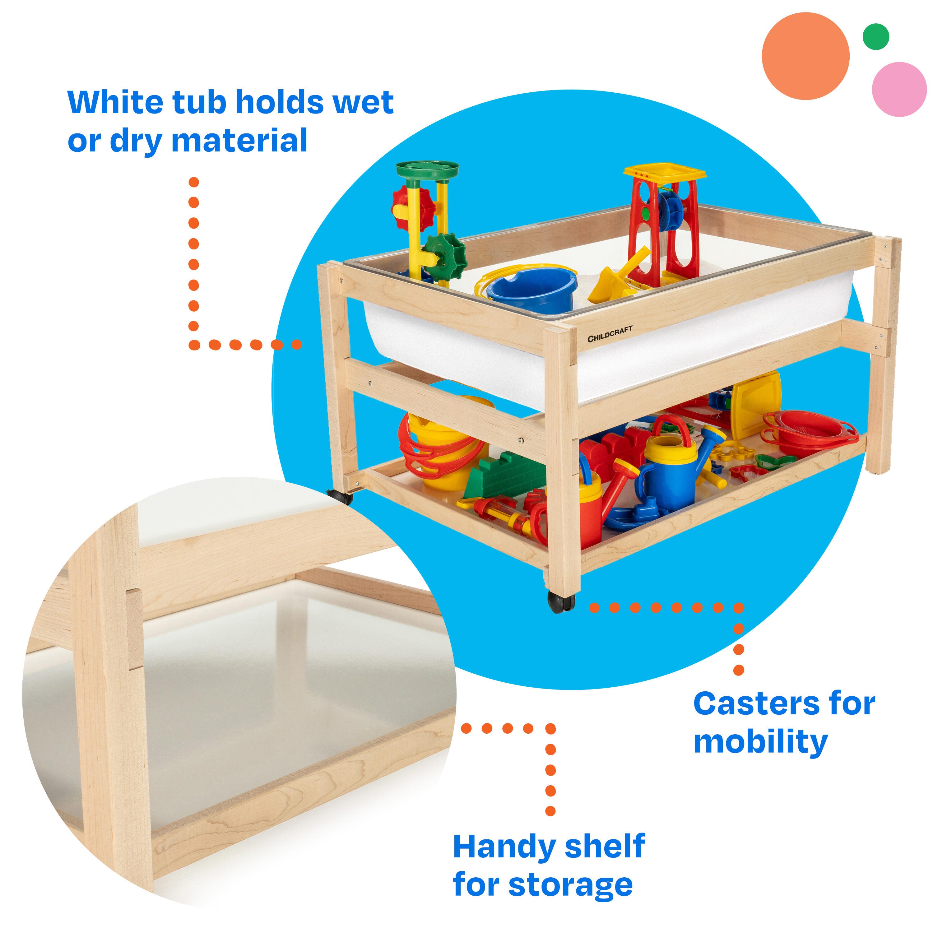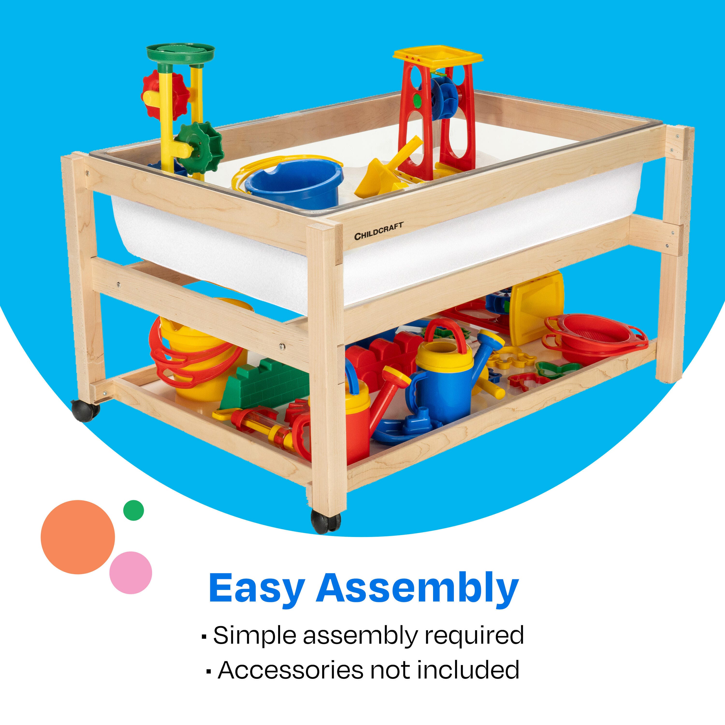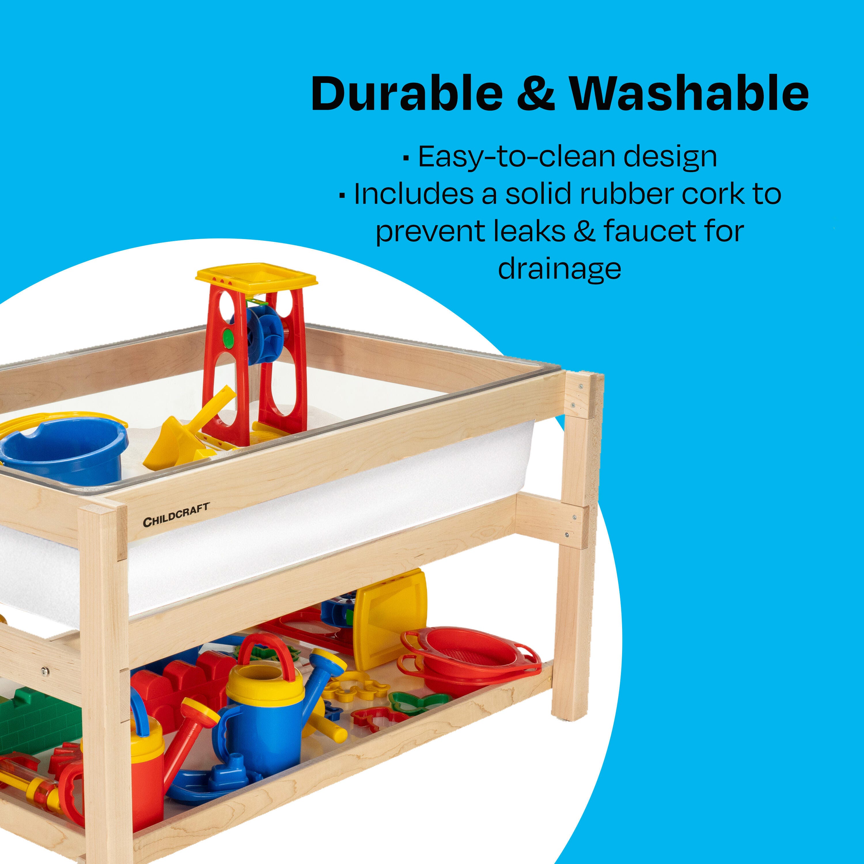 Childcraft® Sand and Water Table provides endless opportunities for sensory play and group interaction. Designed to hold either wet or dry materials, this sturdy wooden table and tub is built for durability and easy cleaning. The included cover converts the unit into a versatile classroom worktable when not in use. A bottom storage shelf makes storing accessories simple. Equipped with casters for mobility, a faucet for easy drainage, and a solid rubber cork to prevent leaks, this sensory table is as practical as it is engaging. Assembly is quick and simple, allowing more time for exploration and creativity. This sand and water table measures 42-3/8 W x 30-1/8 D x 23-5/8 H inches.