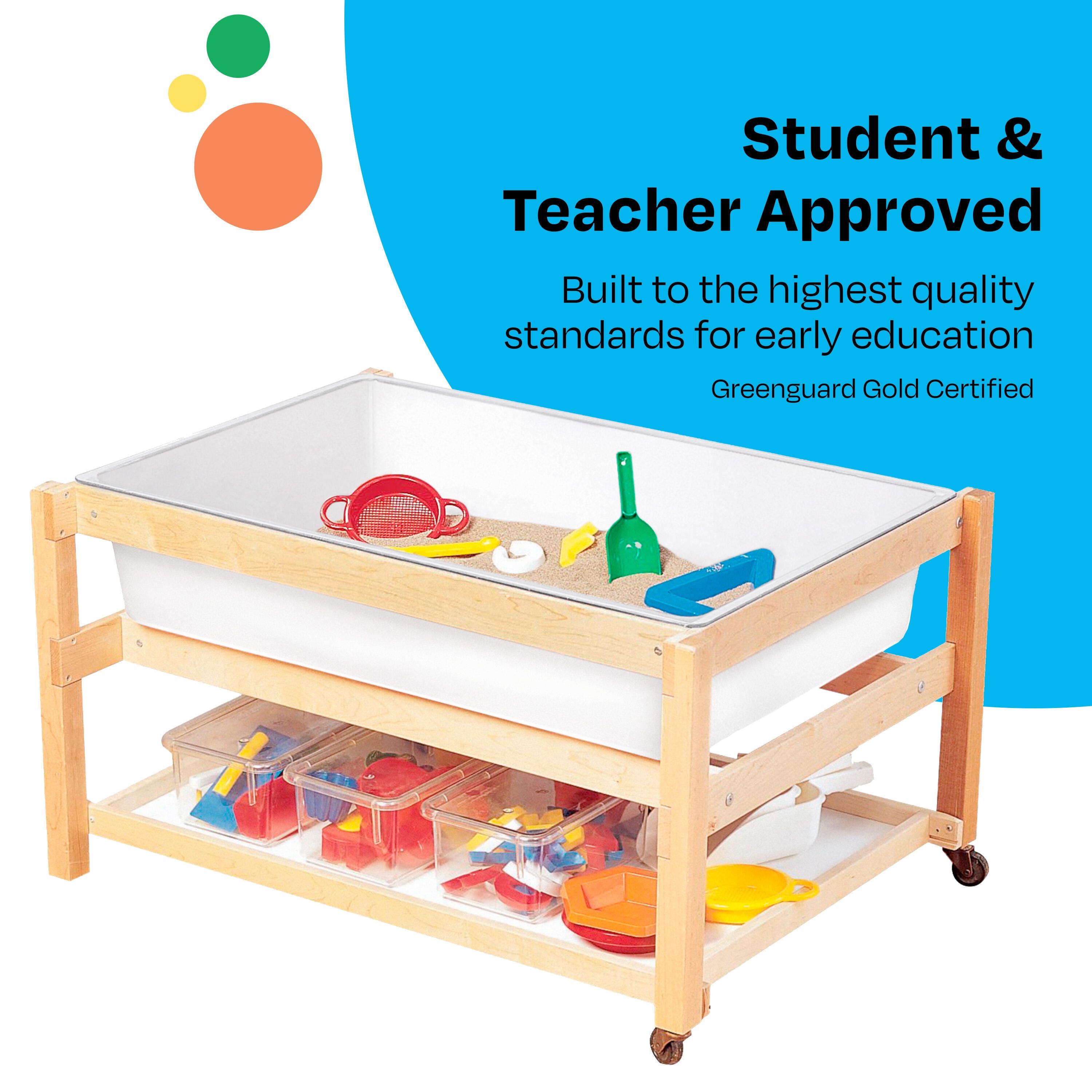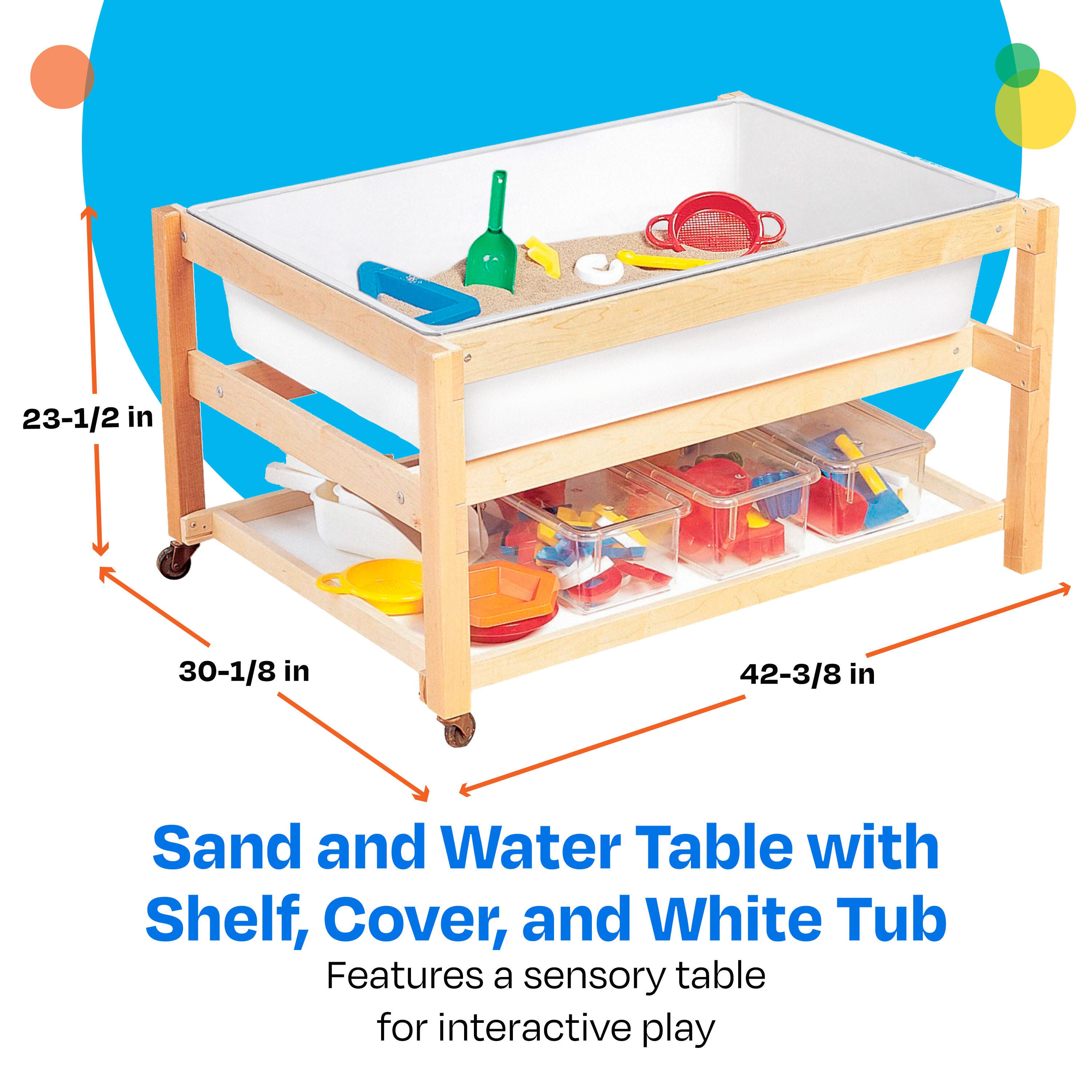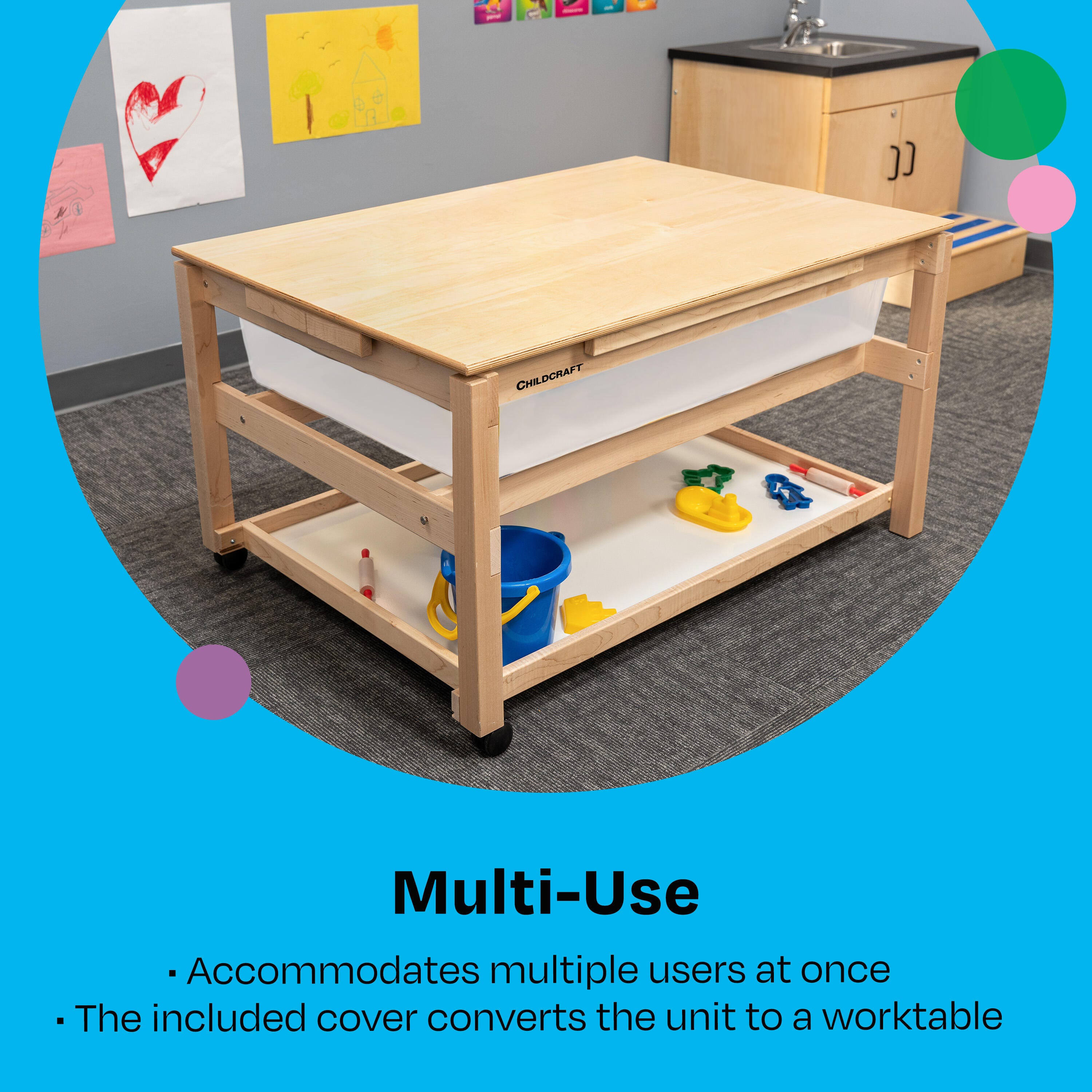 Childcraft® Sand and Water Table provides endless opportunities for sensory play and group interaction. Designed to hold either wet or dry materials, this sturdy wooden table and tub is built for durability and easy cleaning. The included cover converts the unit into a versatile classroom worktable when not in use. A bottom storage shelf makes storing accessories simple. Equipped with casters for mobility, a faucet for easy drainage, and a solid rubber cork to prevent leaks, this sensory table is as practical as it is engaging. Assembly is quick and simple, allowing more time for exploration and creativity. This sand and water table measures 42-3/8 W x 30-1/8 D x 23-5/8 H inches.