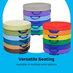 This Childcraft® Round Cushions pack features 6 floor cushions for classroom and indoor/outdoor use. The round seat cushions are soft and durable, giving students a comfy spot to sit anytime and anywhere. Whether playing, learning, or reading, take a cushion on the go. An attached carrying handle provides easy transportation and handling when moving from one spot to another. Use the comfy cushions indoors or outdoors as needed, and put them away when no longer in use. They’re easy to wipe clean to promote long-lasting use and hygiene. The Greenguard Gold Certification ensures furniture items are low emitting and meet or exceed the industry standards for classroom use.Features