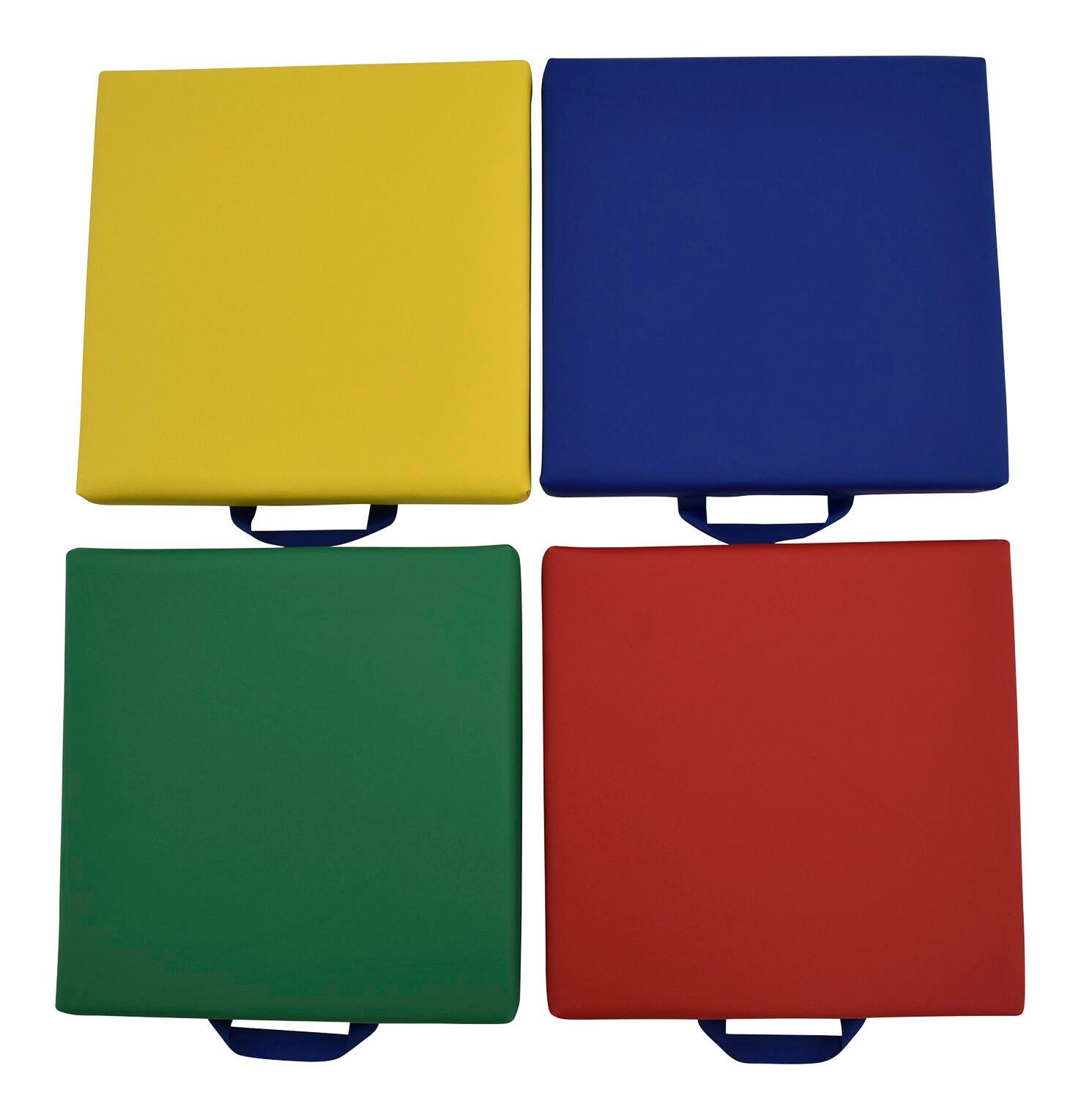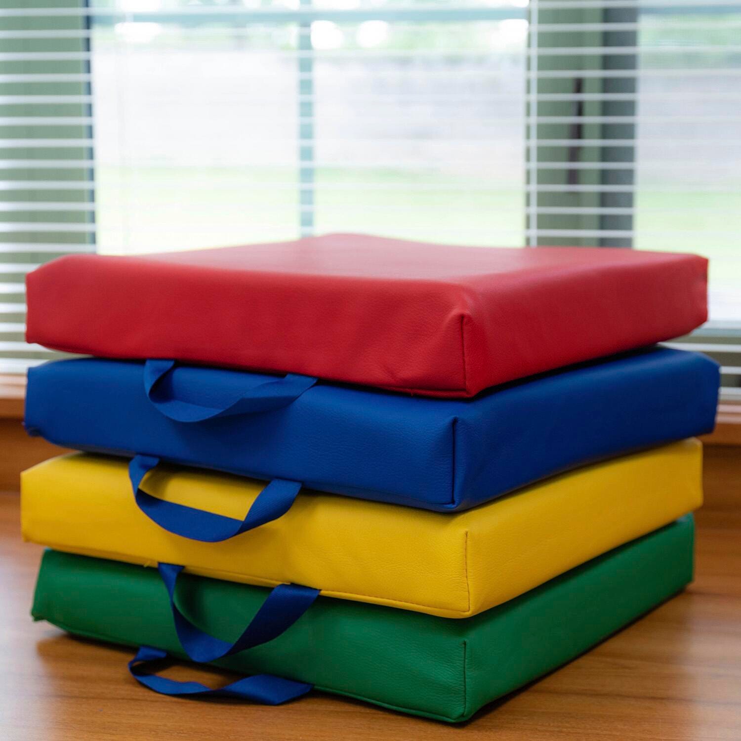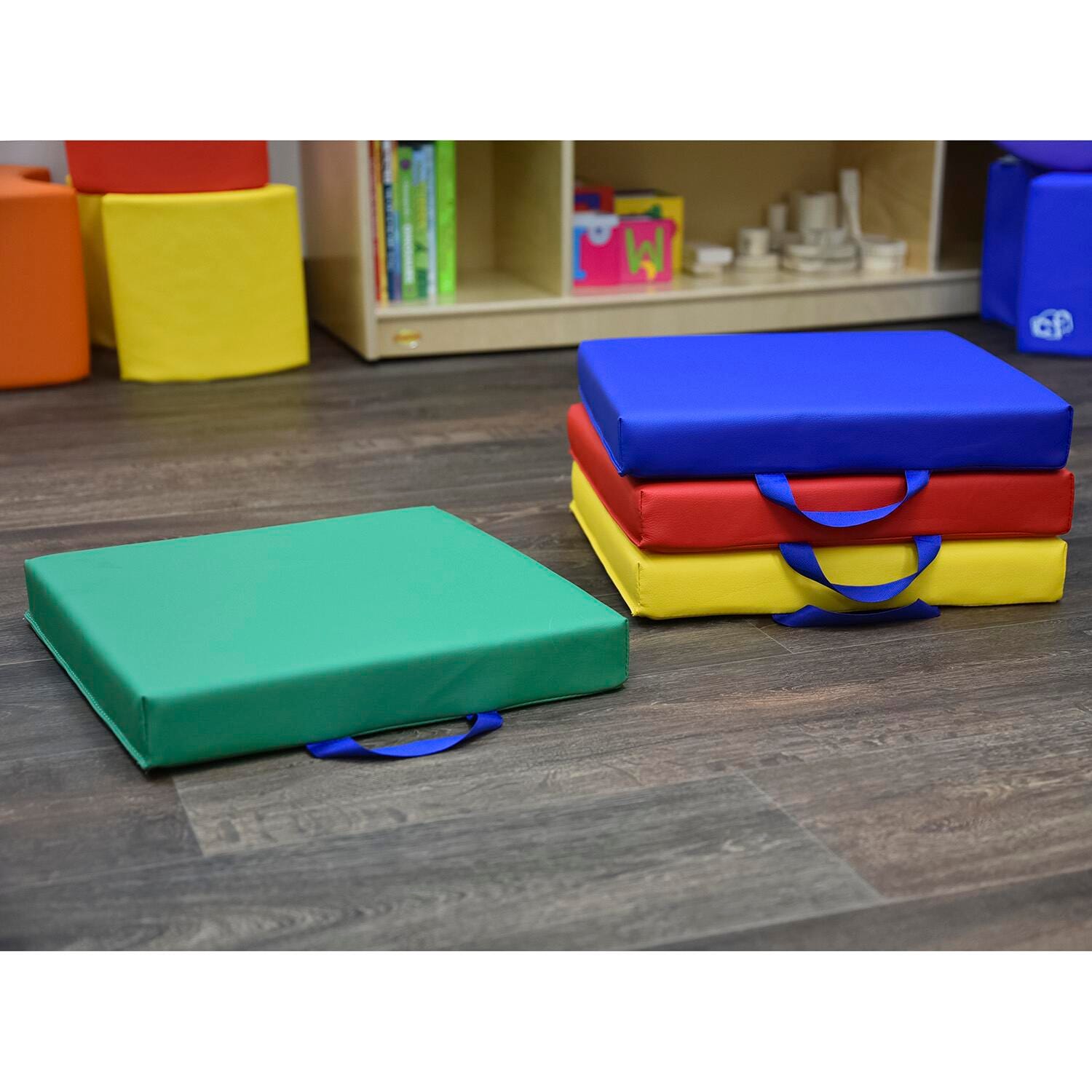 Children's Factory Assorted Preschool 15-inch Square Floor Cushions, with 2-1/2-inches thick, are perfect for circle time, reading corners, and quiet play spaces in classrooms, daycares, and homes. Covered in durable, easy-to-clean vinyl and available in four bright, cheerful colors, this floor cushion set encourages active sitting while helping children define their personal space.Features