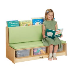 This compact reading couch is perfect for waiting rooms and small spaces. Generous book slots hold a multitude of books while the three, included clear Tubs are great for housing literacy items and learning materials. Comfortable key lime green cushions provide a pop of color and are easy to clean.Features