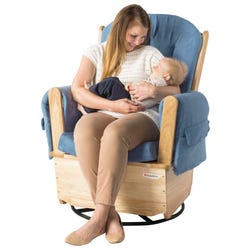 Foundations Safe Glider Rocking Chair measuring 26 W x 26 D x 42 H inches is ideal for both the caregiver and child that offers an extra wide seating surface with extra thick, high-density foam cushions for added comfort. Swivel glider chair features a fully enclosed base for keeping the children safe from gliding mechanism and is naturally finished with blue cushion.Features