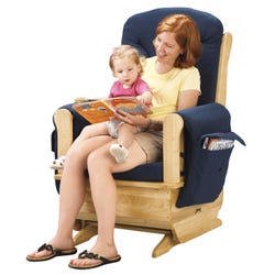 Jonti-Craft Glider Rocker featuring a special design is enclosed on the front and sides to keep little fingers and toes safe. Rocker with heavy-duty construction has super smooth, quiet glide mechanism that is specially designed for youngsters to enjoy. Rocker measuring 30 W x 23-1/2 D x 43-1/2 H inches has a 20-inch, extra-roomy seat and is tip-resistant. Armrests offer enhanced comfort and include pockets with covers for convenient storage. Navy seat cushion cover made from 100% polyester is machine washable and meets CA-117 fire standards.