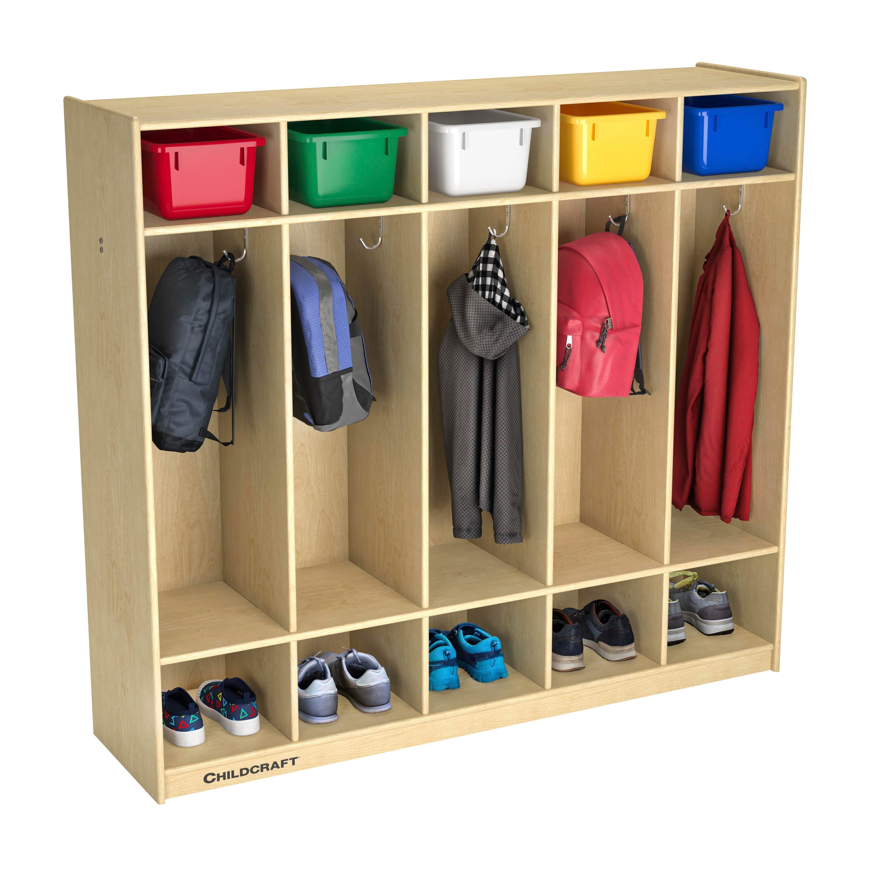 The Childcraft® Coat Locker with 5 Sections is a space-saving storage solution designed to keep coats, backpacks, and personal items organized and accessible. Each locker section includes two solid aluminum hooks (one on each side) for hanging coats or bags, while upper and lower cubbies provide additional room for shoes, lunchboxes, books, or other supplies. With a narrow footprint and open design, this cubby locker is perfect for early learning environments. Crafted from durable birch plywood with a smooth, easy-to-clean finish, this children’s locker is built to withstand everyday use. Measures 53-3/4 W x 14-1/4 D x 48 H inches. Arrives fully assembled. Must be wall-mounted for maximum stability; not recommended as a room divider.Features