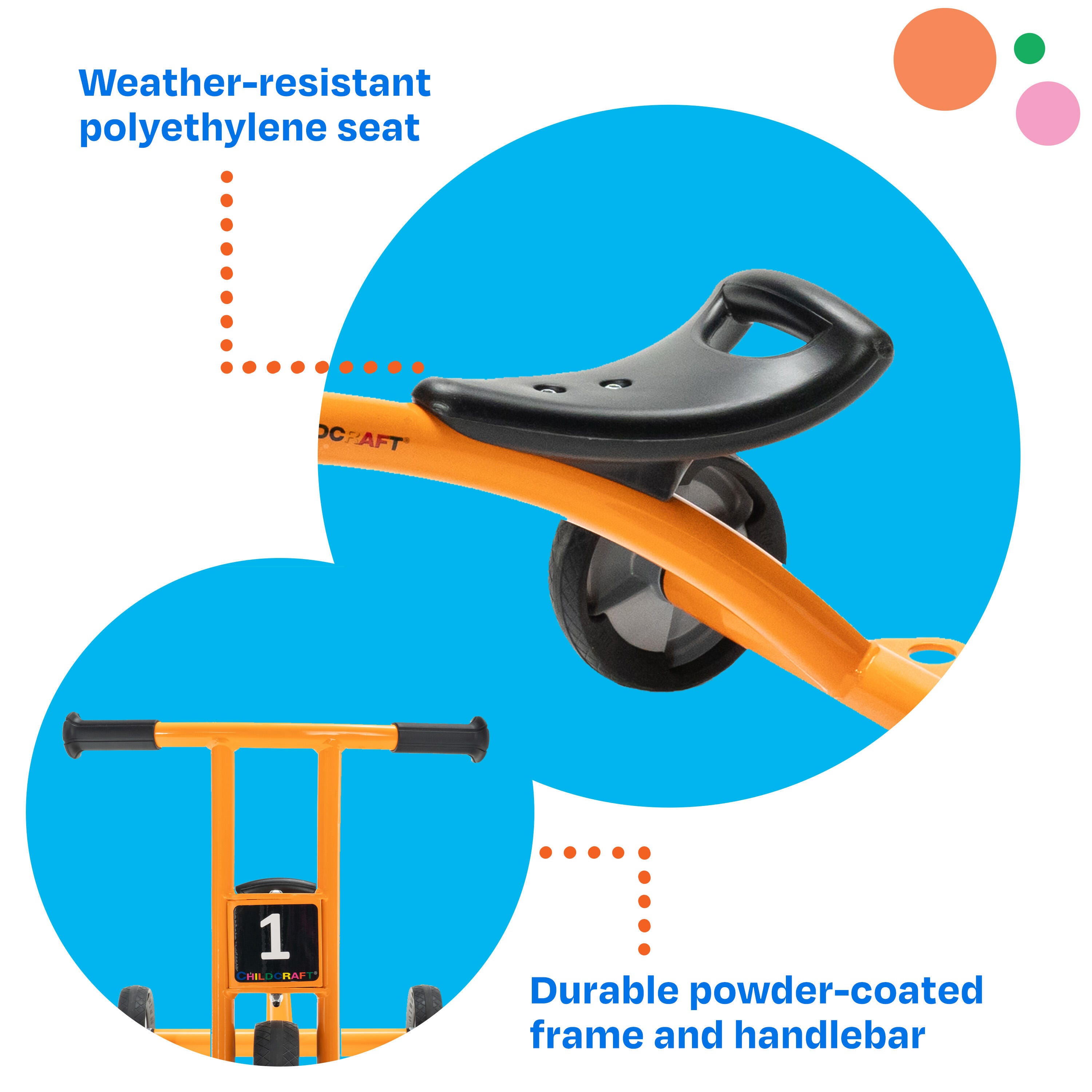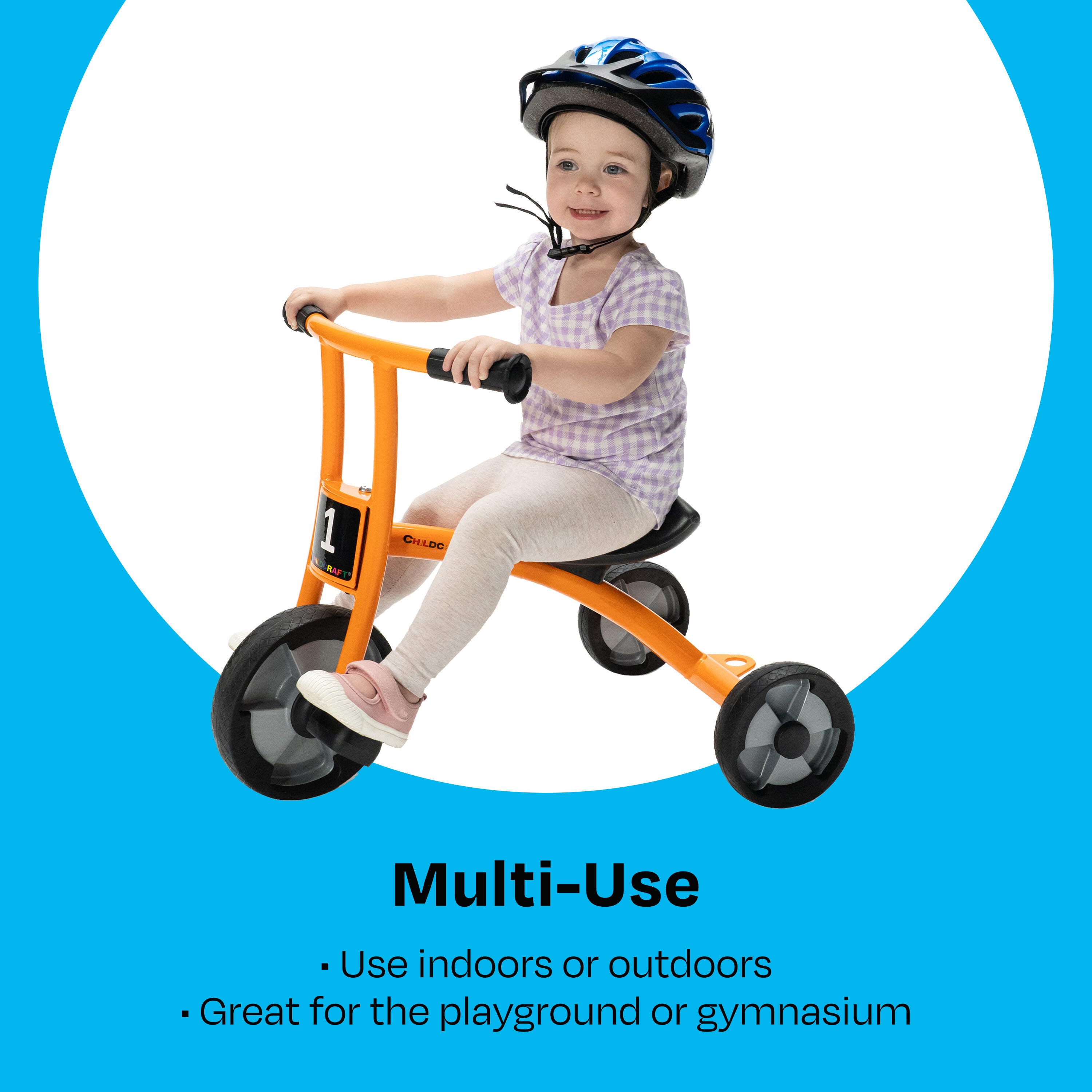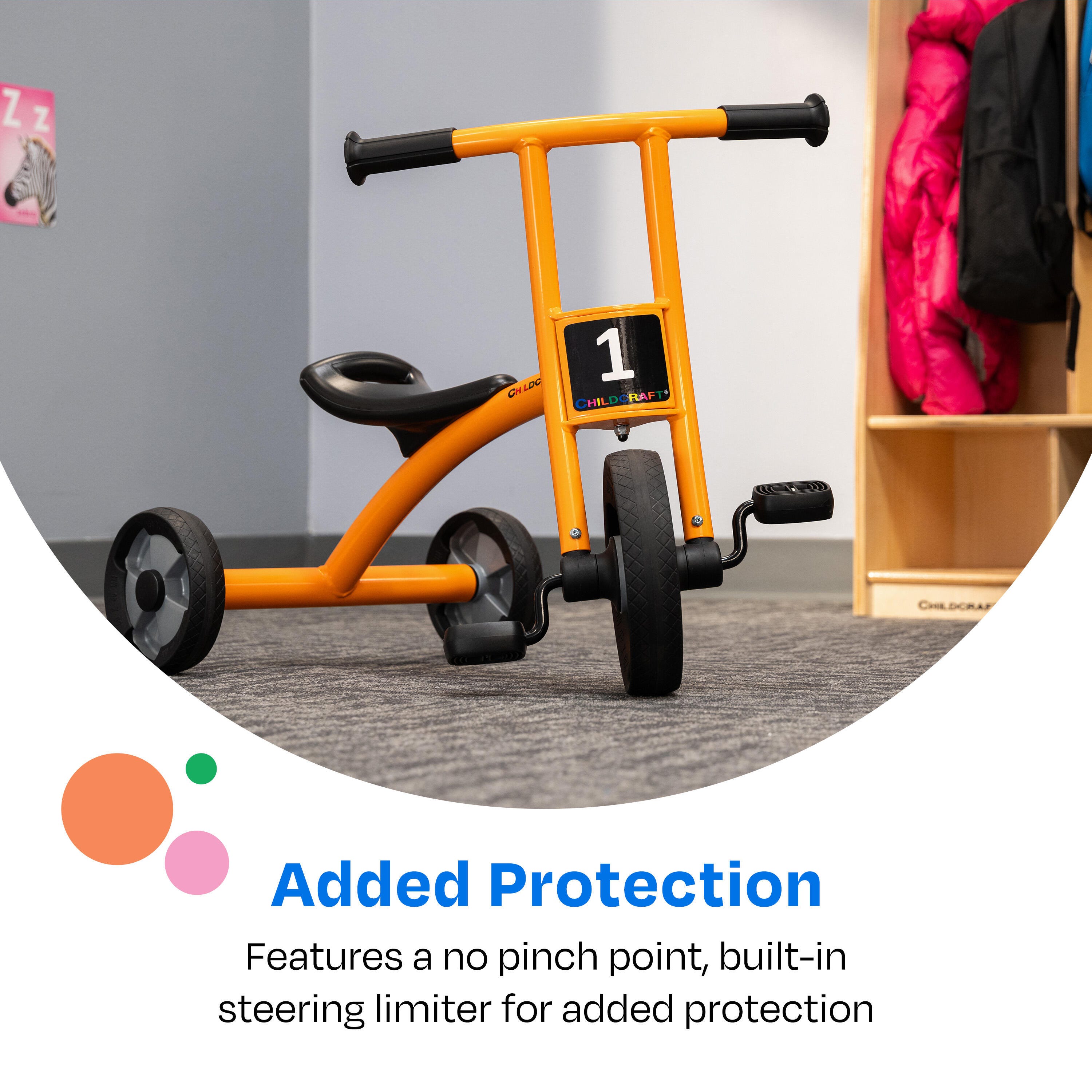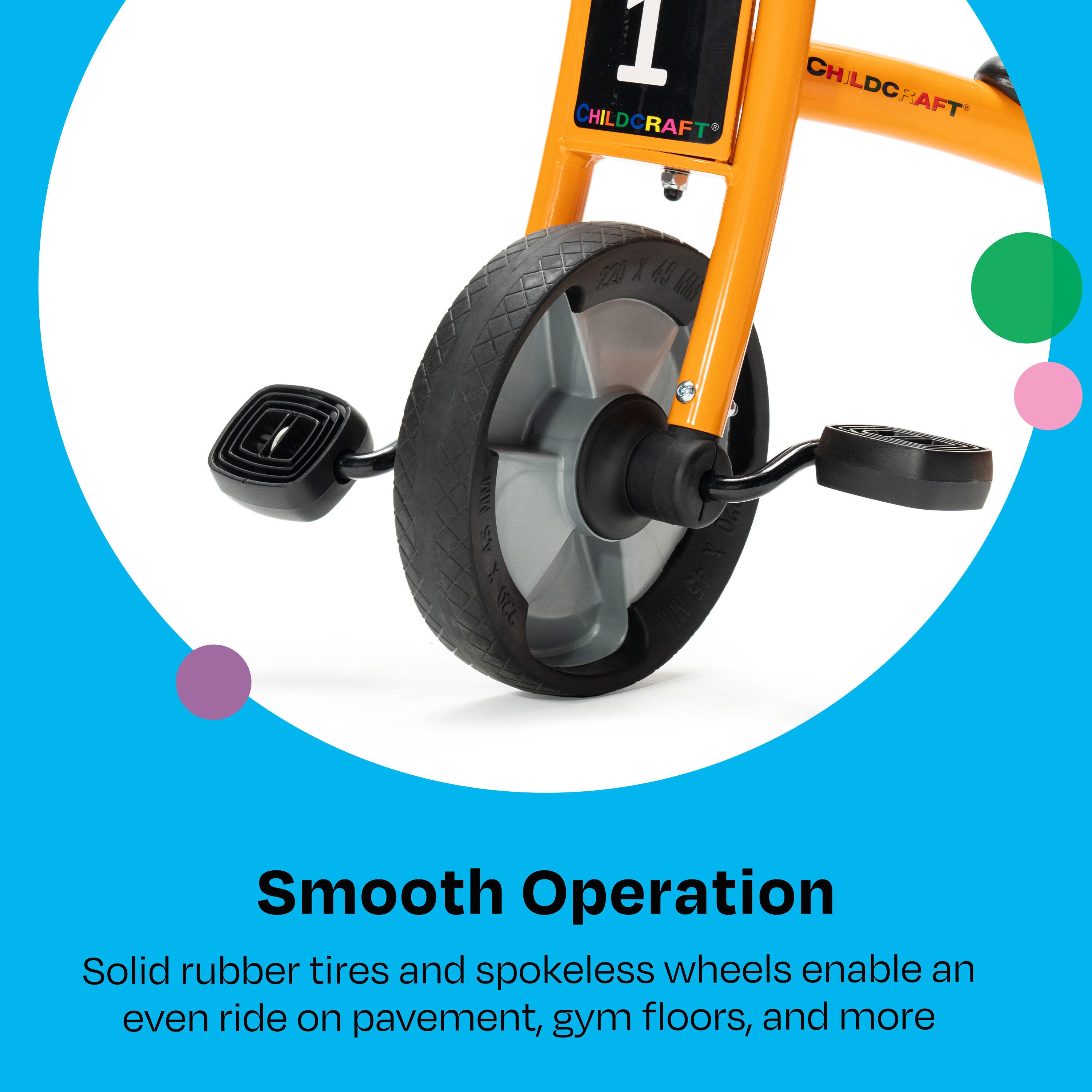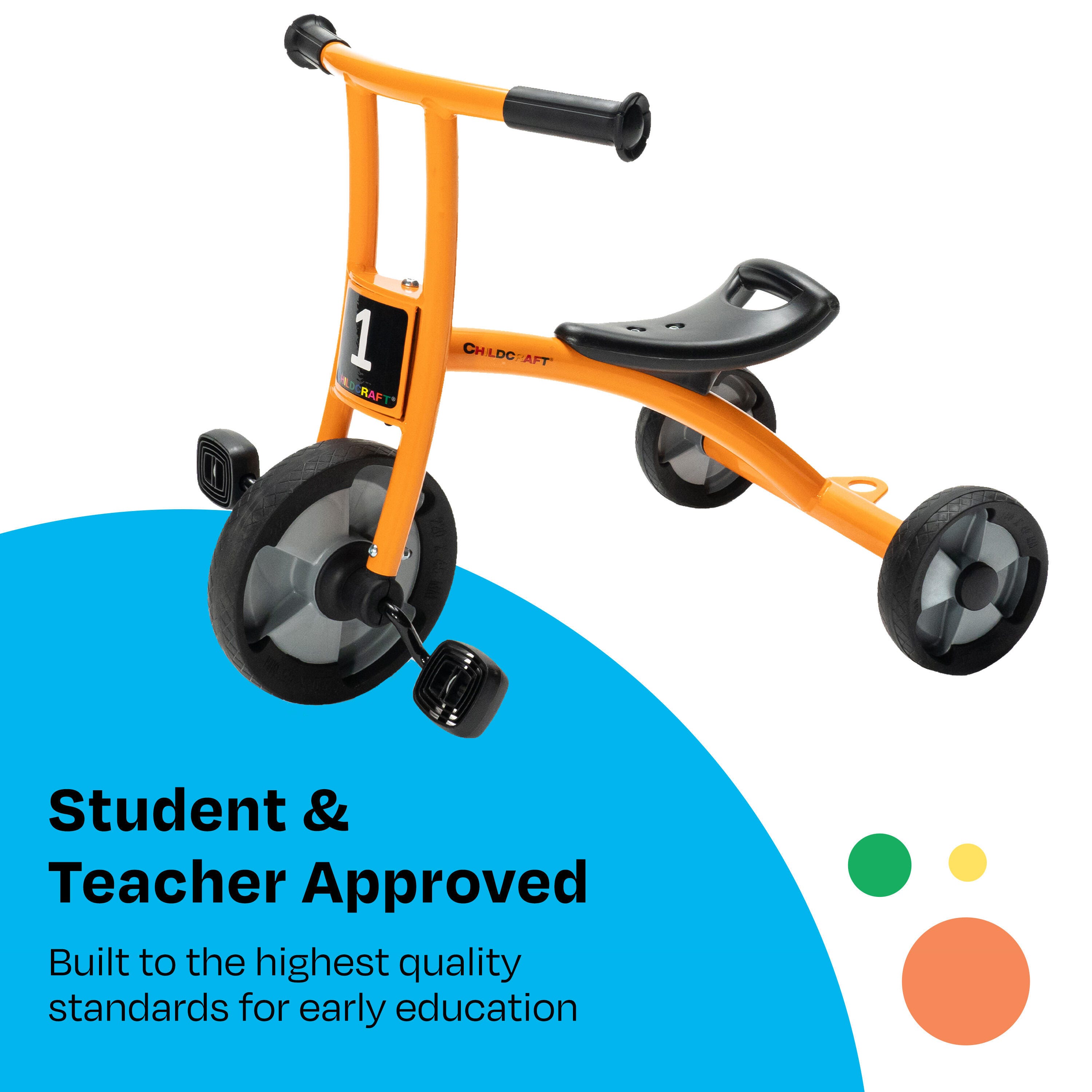 This Childcraft® Tricycle is designed for young children ages 2 to 4 to safely enjoy the freedom of movement and build strength. The heavy-duty tube construction and powder-coated frame ensure durability, while the weather-resistant polyethylene seat stands the test of time. Its solid rubber tires and spokeless wheels provide smooth operation on various surfaces, including pavement and gym floors. Designed with safety in mind, the toddler tricycle features a no-pinch point steering limiter for added protection. It has a 10-inch seat height, a maximum weight capacity of 160 pounds, and a 5-year warranty that covers the frame and fork.