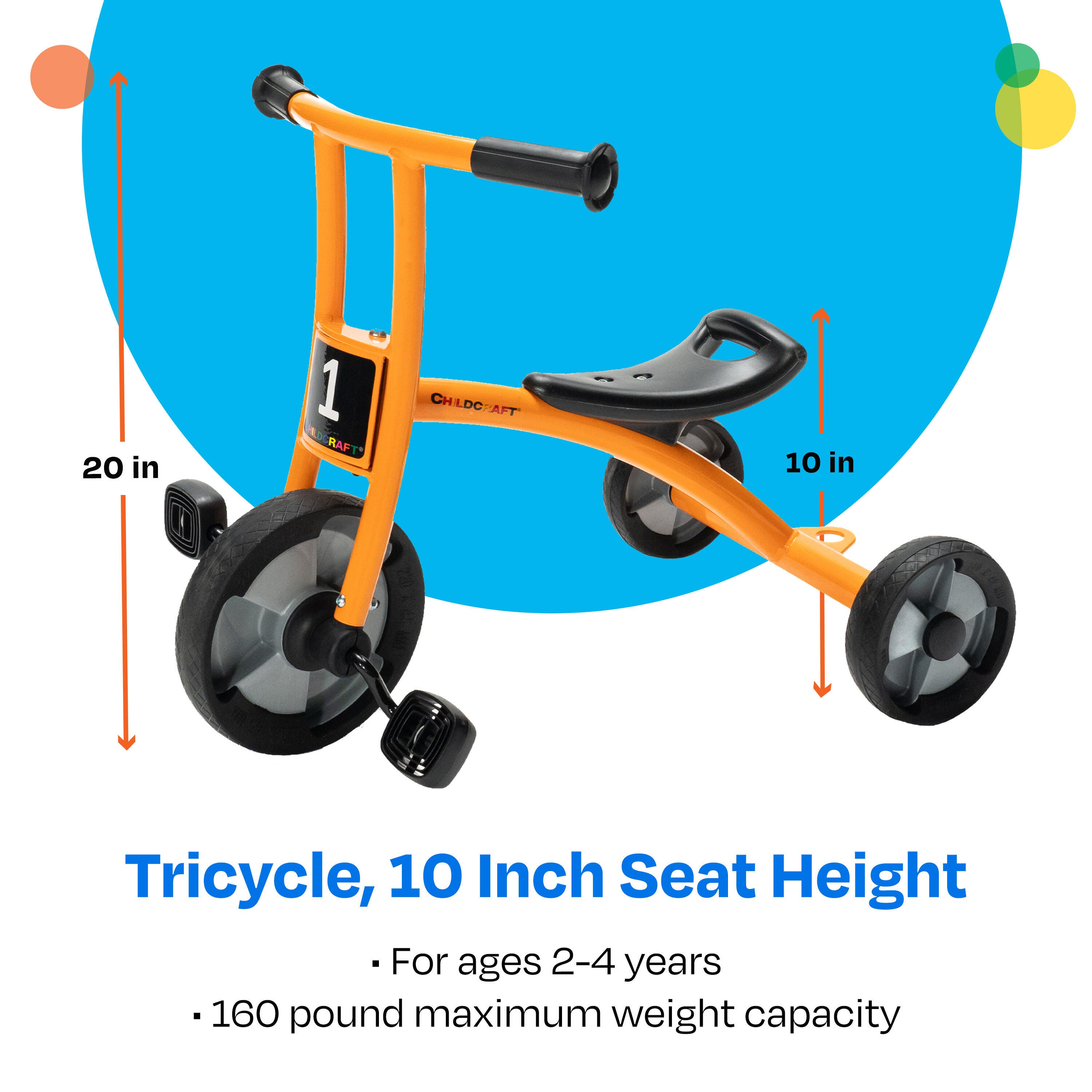 This tricycle has a 10-inch seat height and 20-inch overall height to accommodate children ages 2 to 4