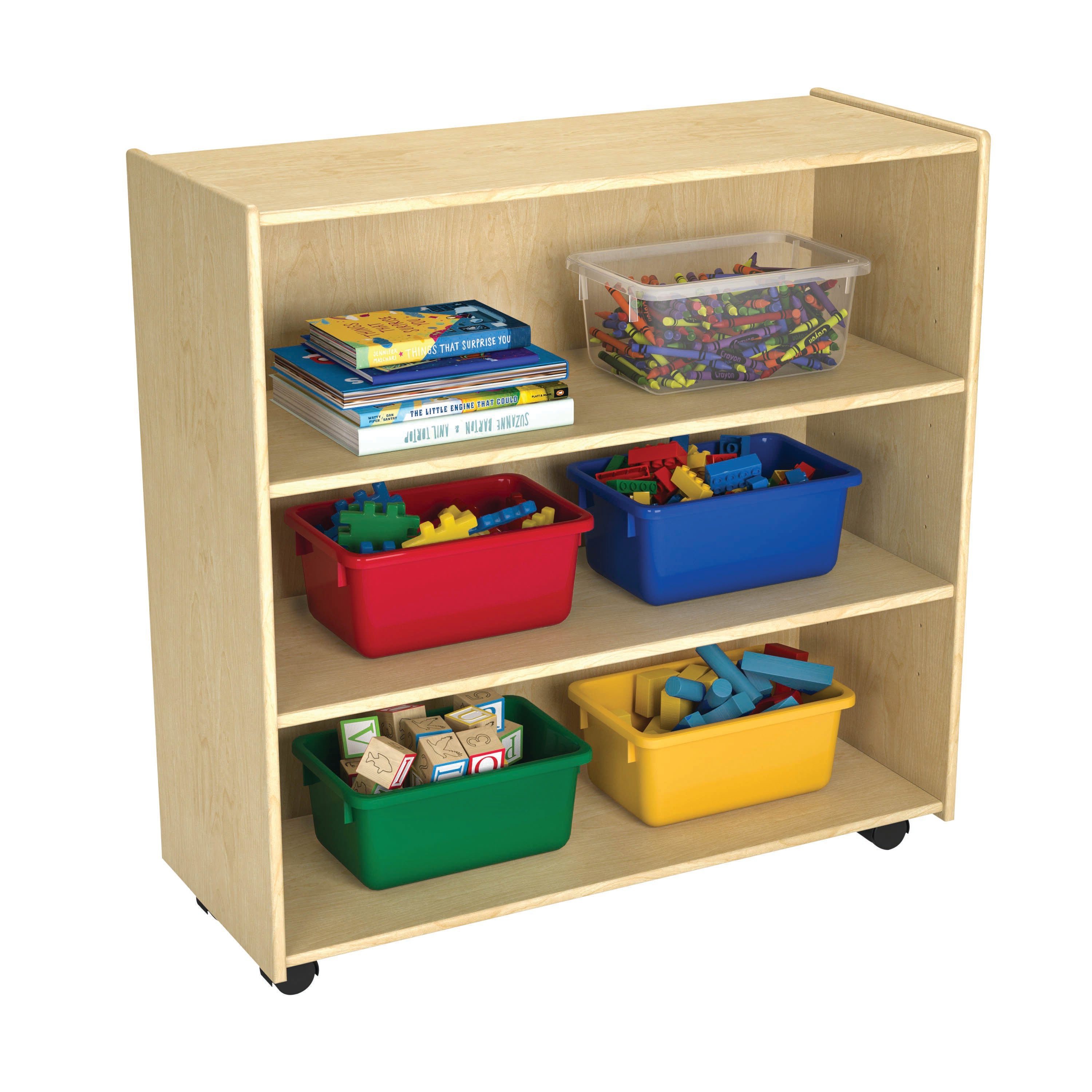 The Childcraft® Mobile Open Adjustable Shelving Unit provides a flexible and functional storage solution for early childhood classrooms, childcare centers, libraries, or playrooms. With a height designed for young learners, this 3-shelf cabinet offers open access to books, puzzles, and more, making independent learning easy and safe. The adjustable shelves allow you to customize the interior for your specific storage needs. The durable birch plywood construction ensures the bookcase stands up to daily classroom use. Four heavy-duty, dual-wheel locking casters make repositioning easy and secure. Comes fully assembled. Measures 35-3/4 W x 14-1/4 D x 36 H inches.Features