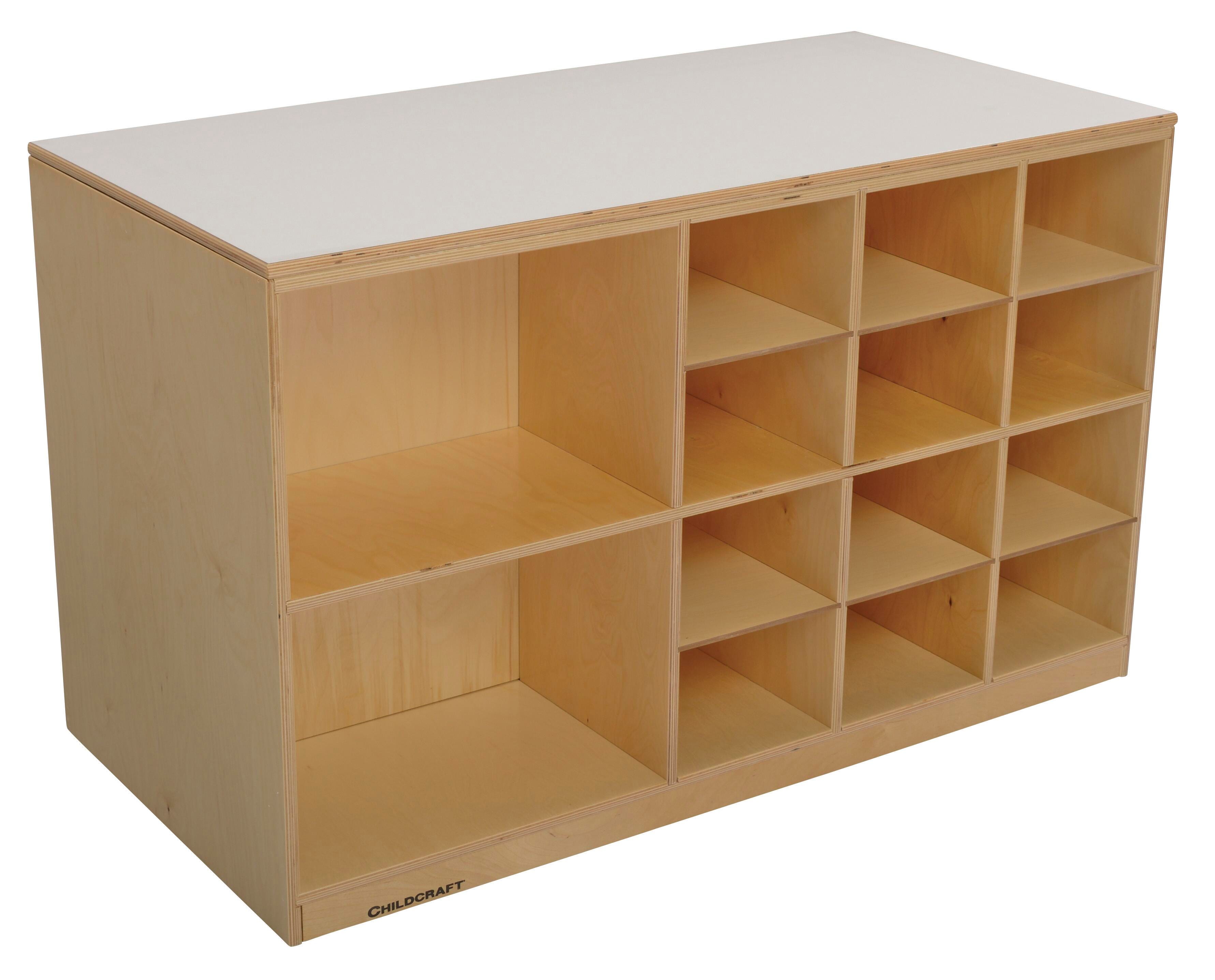 - Double-sided storage with open shelves on one side and 14 spacious openings on the other; great for bins, books, arts and crafts supplies, and classroom essentials