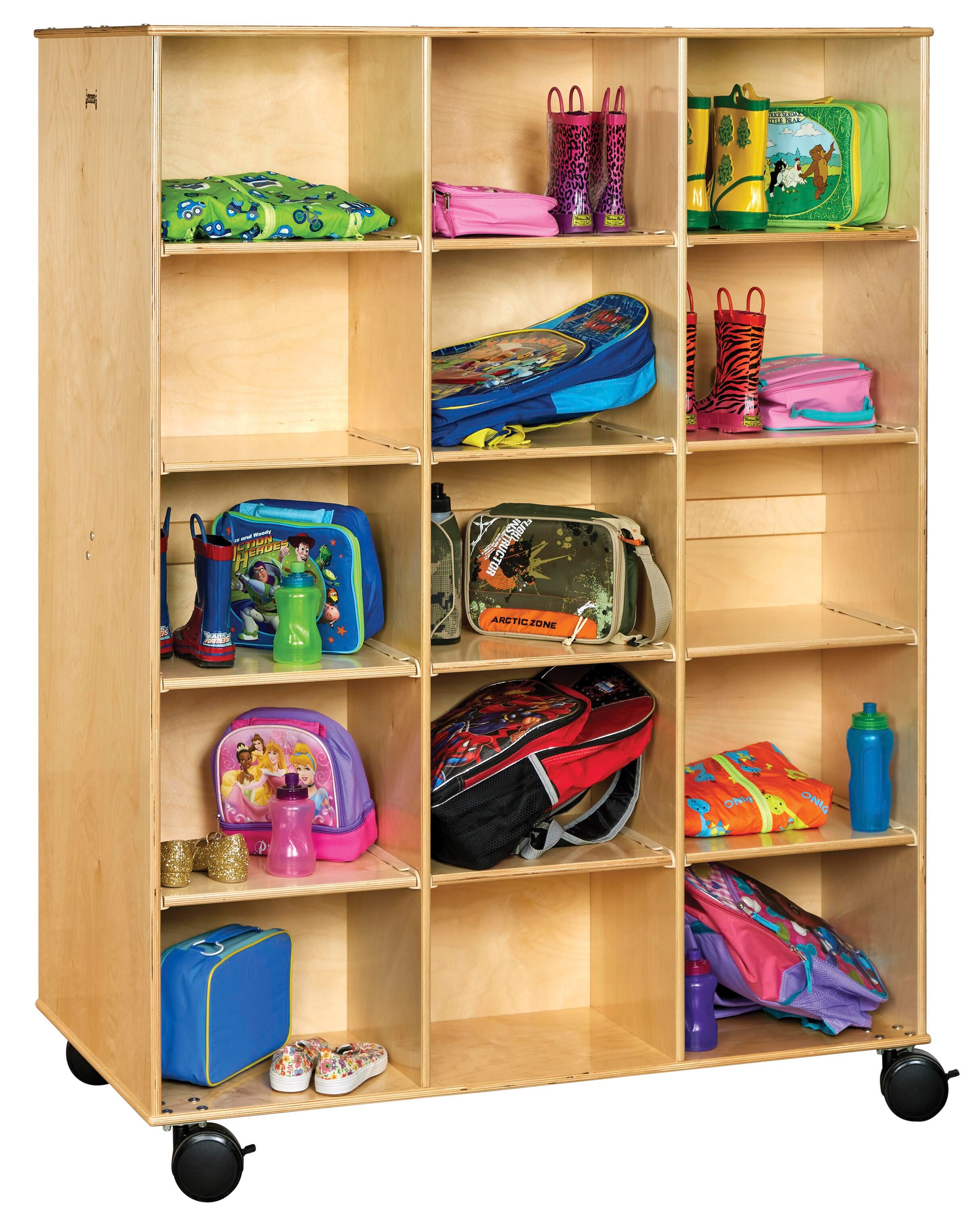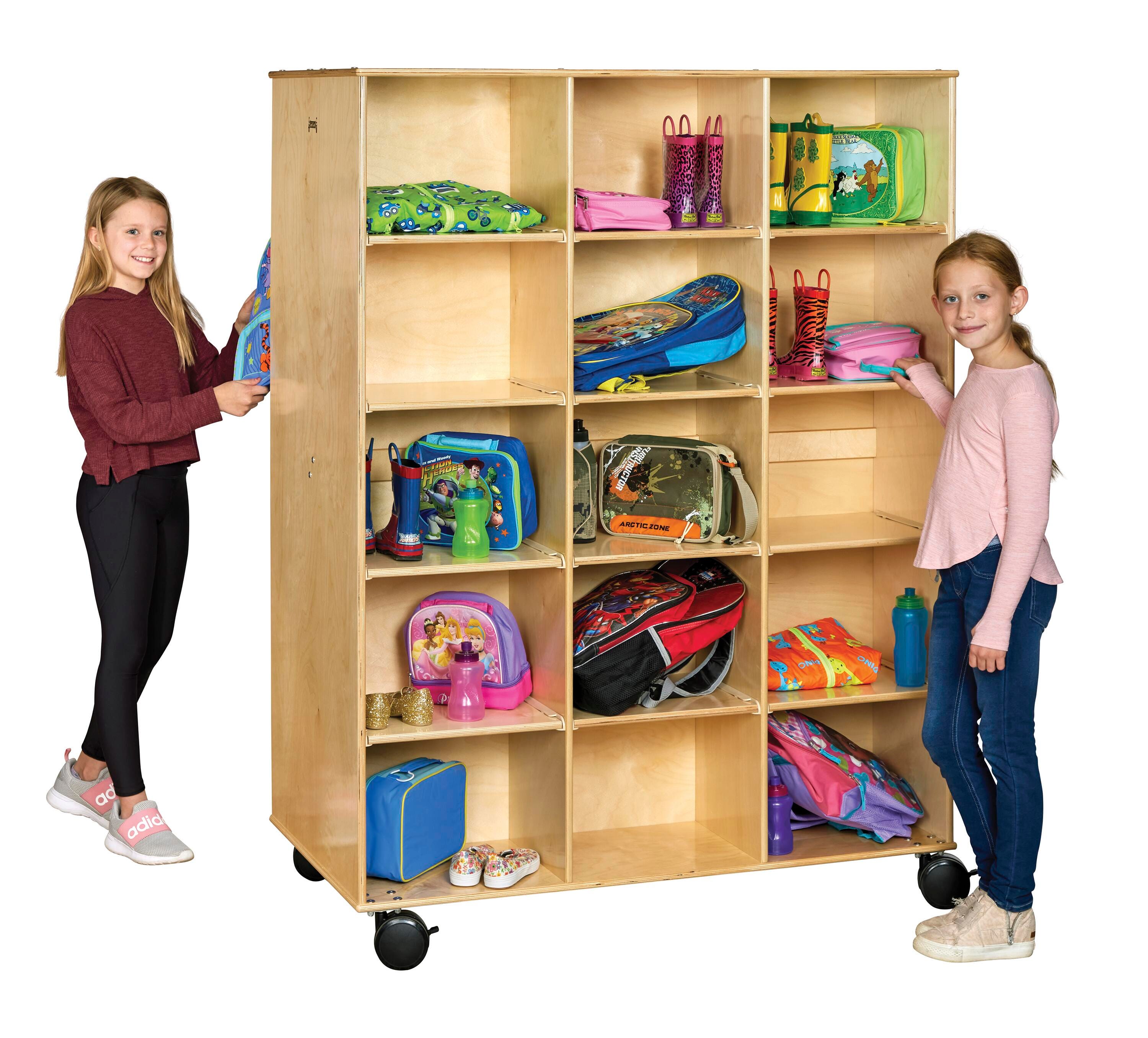 Jonti-Craft Big Twin Storage Unit measuring 48 W x 27 D x 65 H inches is ideal for school age programs or daycare centers. Features two identical sides with fifteen spacious cubbie holes of size 15-1/2 W x 13 D x 12 H inches and heavy-duty locking casters.Features
