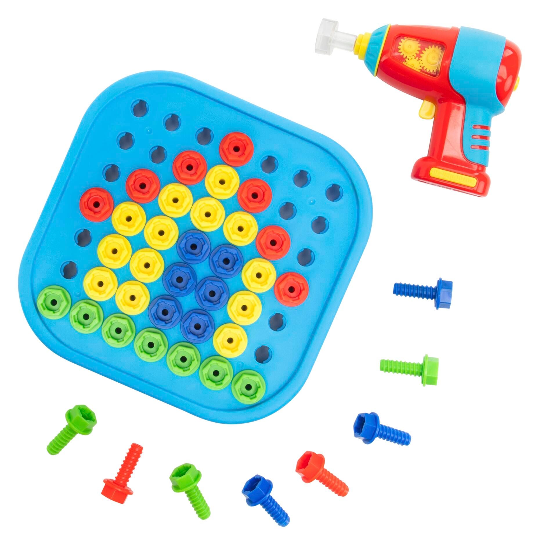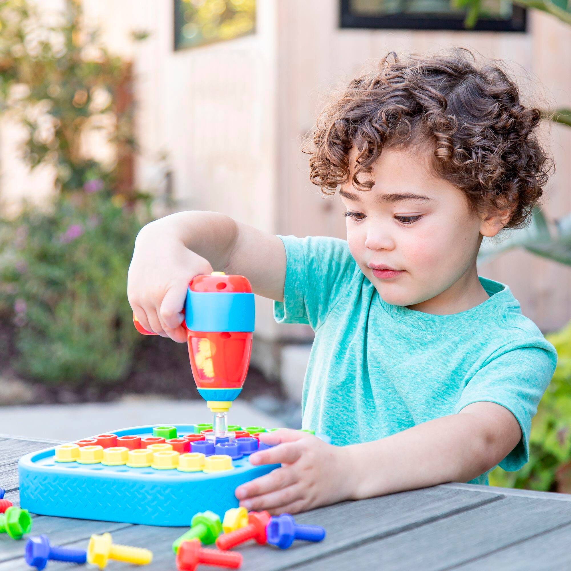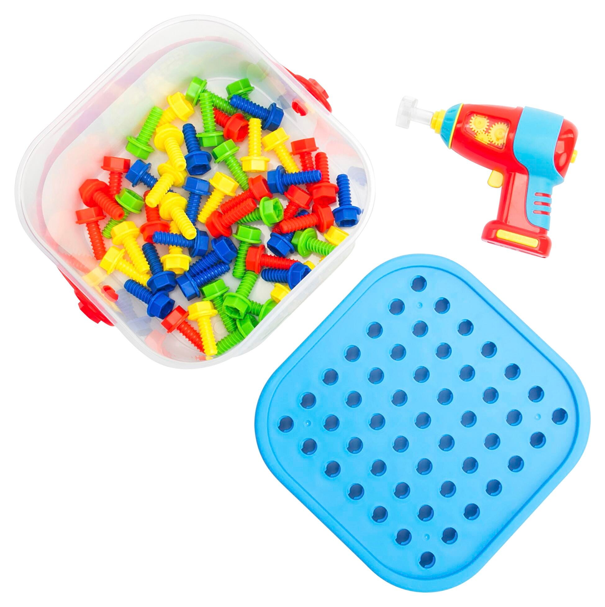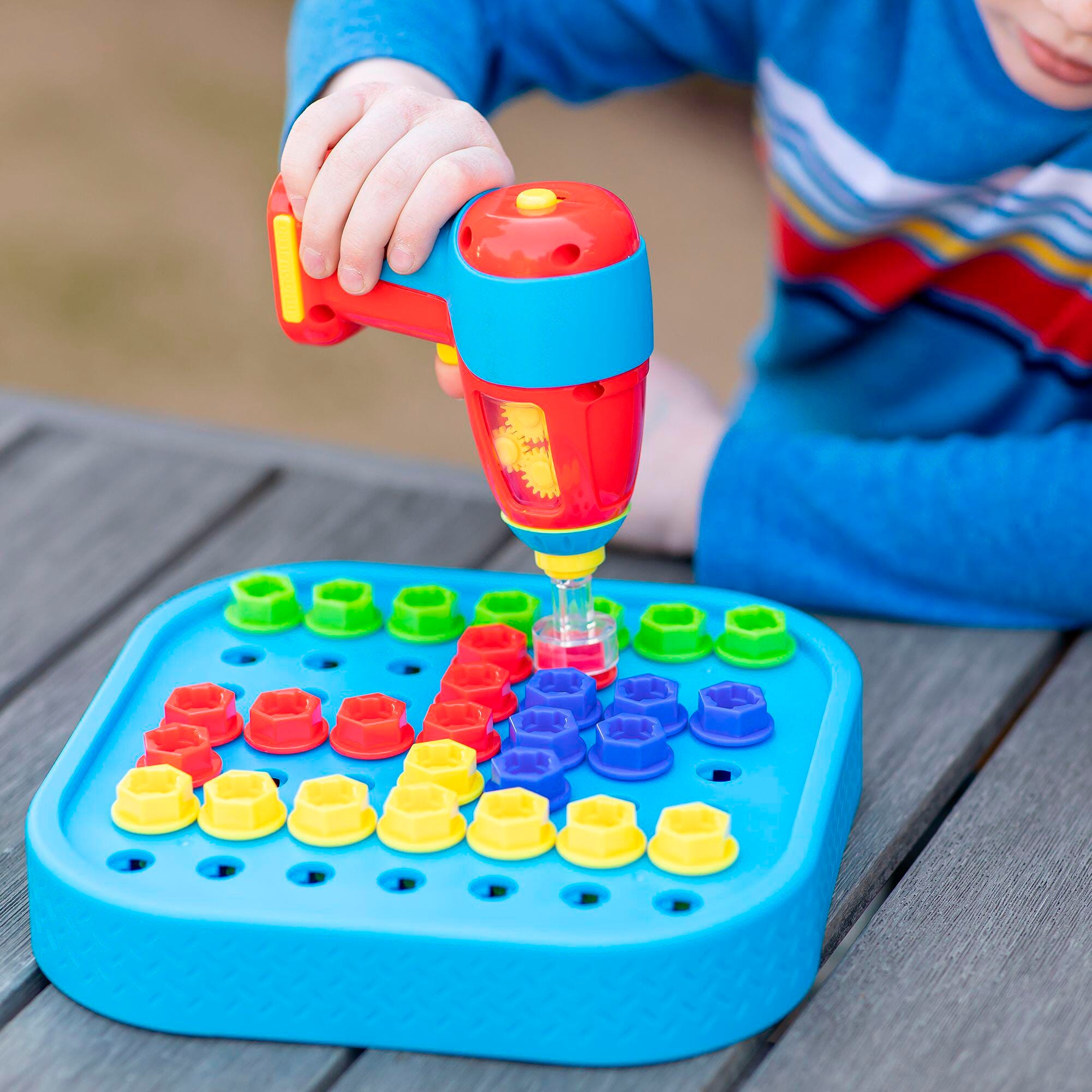Develop fine motor skills and hand-eye coordination through using the play drill and bolts