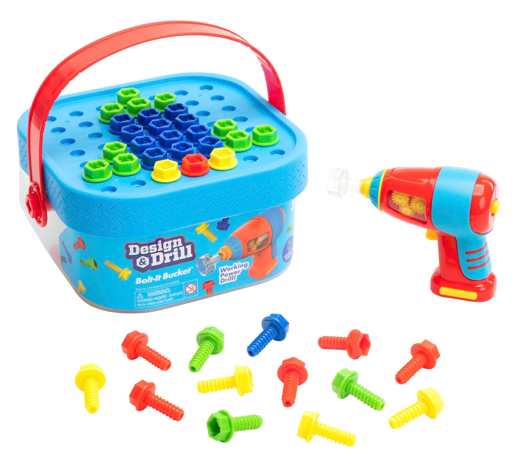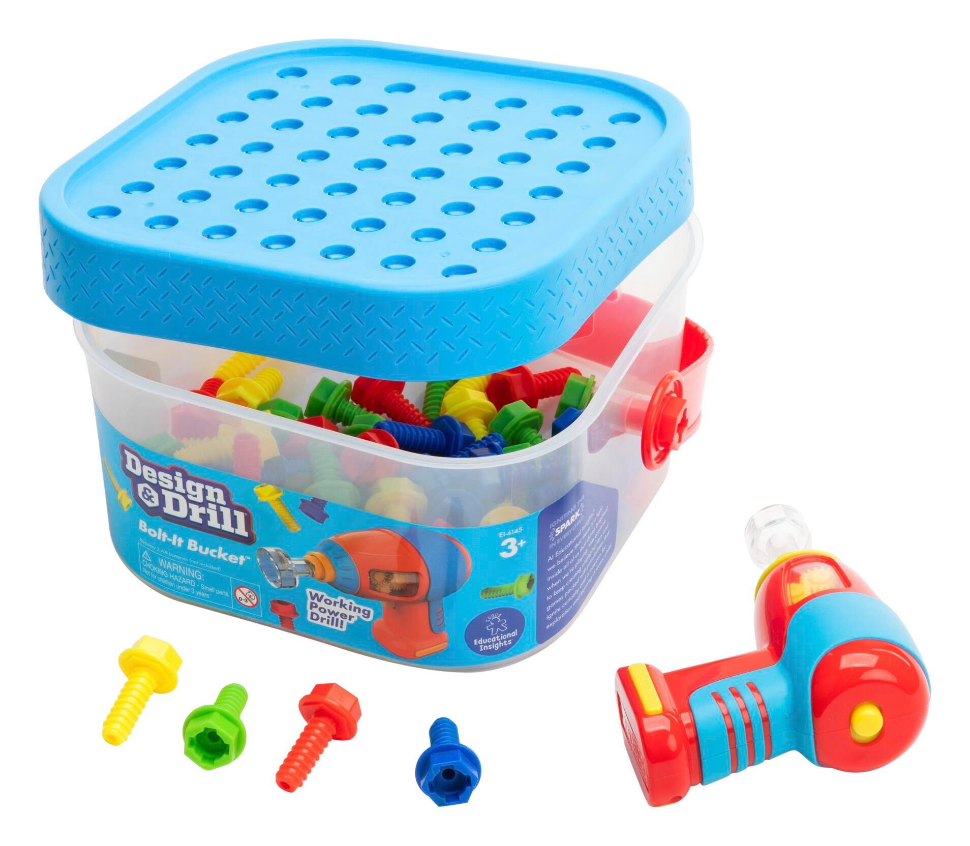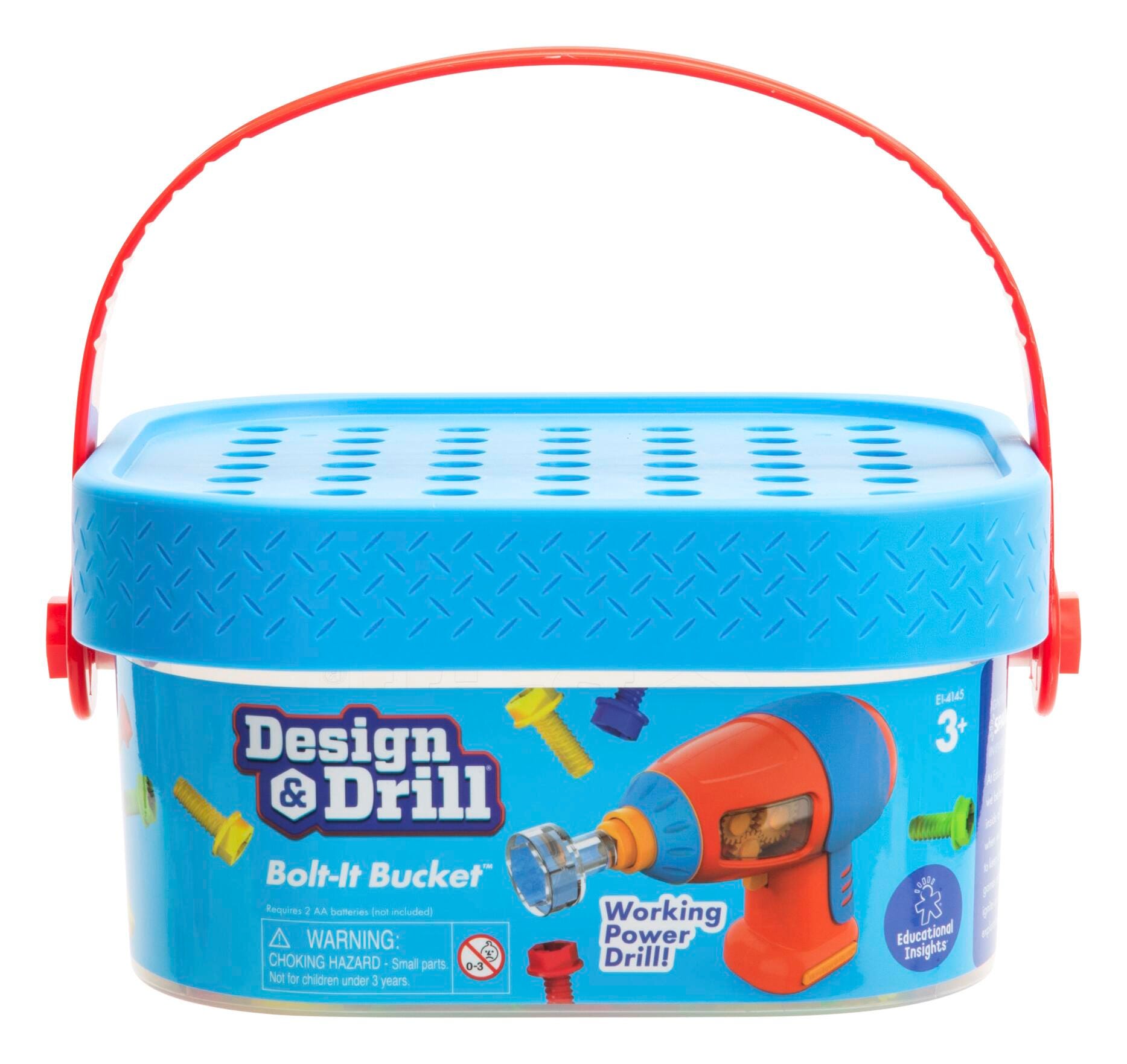The Design & Drill Bolt-It Bucket is built for creative construction play on the go! Perfect for budding engineers and aspiring builders, everyone in daycare or preschool will love the child-friendly power drill to attach colorful bolts to the lid of this sturdy building bucket. Create your own experience through custom designs for a dynamic play experience or follow the included patterns with the Bolt-It Bucket's activity board lid for guided play. Appropriate for ages 3 years and up. Requires 3 AAA batteries (not included).