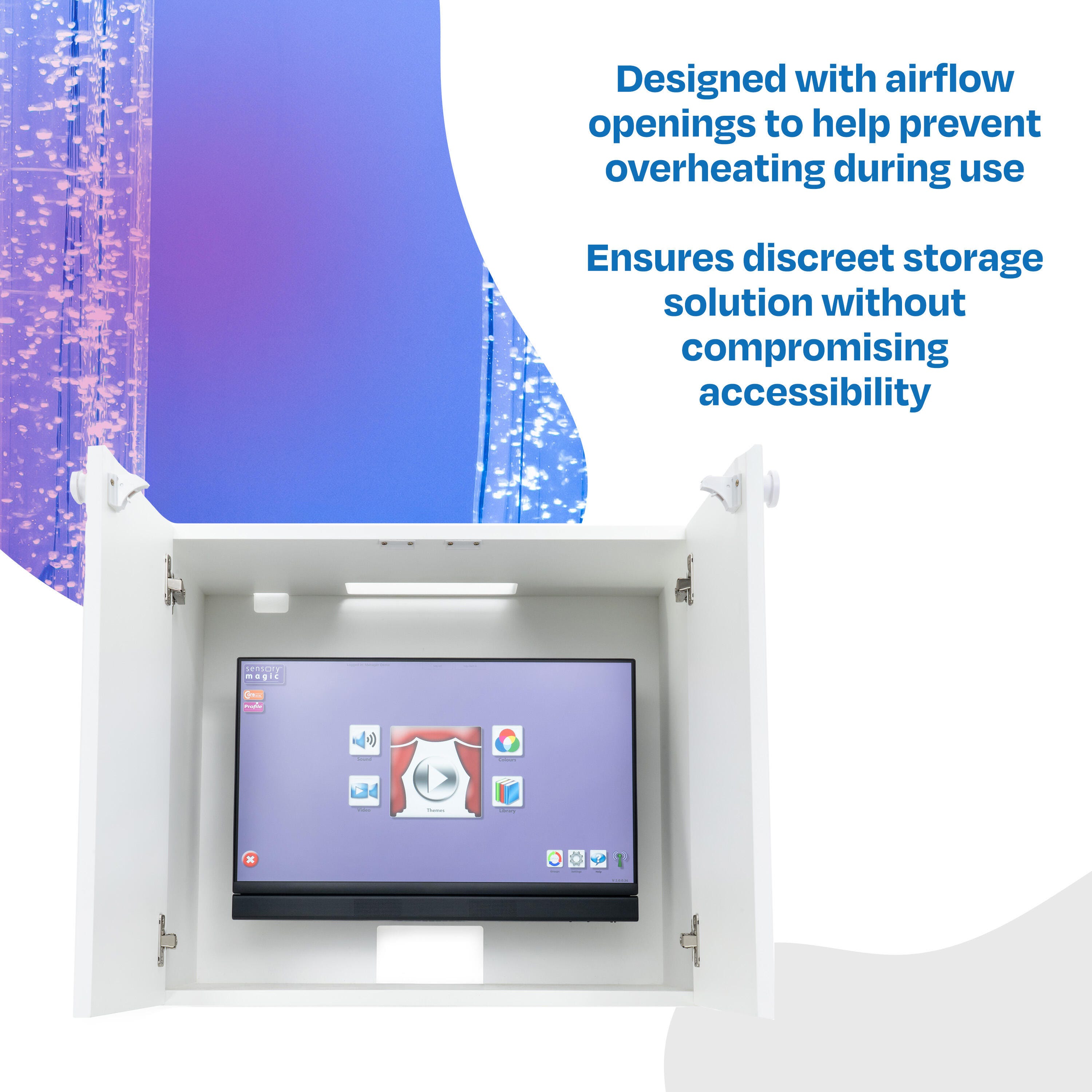 • Offers secure, lockable storage for Sensory Magic devices; ideal for busy sensory spaces or healthcare facilities