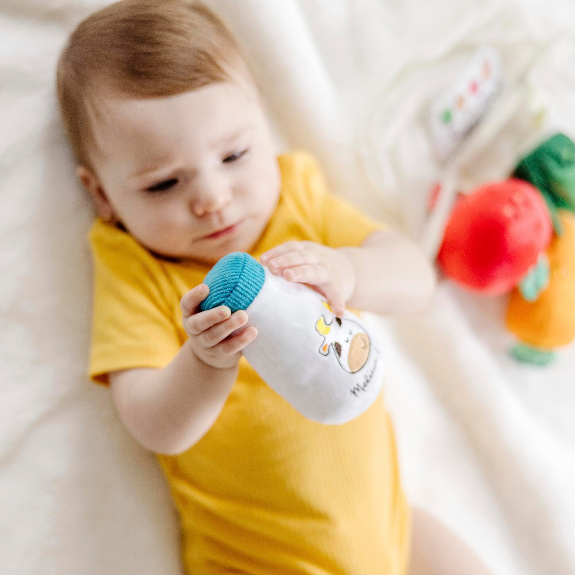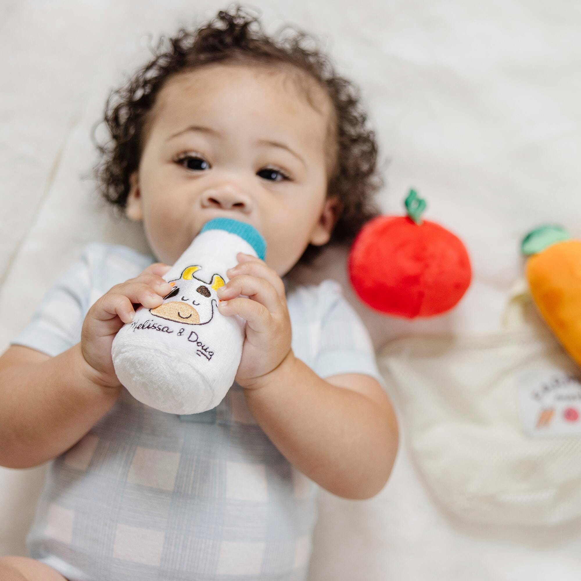 Fill the mesh mini-grocery tote with a squeaking carrot, chiming milk bottle, rattling tomato, and crinkling lettuce, all featuring sweet, friendly faces. Pull out the easy-to-grasp pieces and refill the tote again and again! The Market Basket Fill & Spill is an engaging way to help infants six months and older develop important sensory, fine motor, and color recognition skills.