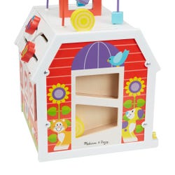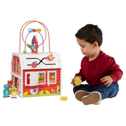 This barn-shaped activity cube has it all—beads to spin and slide along two coated wire mazes, six removable play pieces to match and sort, flaps to open and close, and even hay bales to drop and roll down the chute! Open numbered windows to discover surprises inside, push the tractor with gear wheels along the track, open and close the barn doors, flip pieces to match three animals in a row, and so much more! Sturdy wooden construction, paired with whimsical farm-themed designs, make this a long-lasting and welcome addition to any playroom. Adult assembly is required. Appropriate for ages 12 months and up.Features