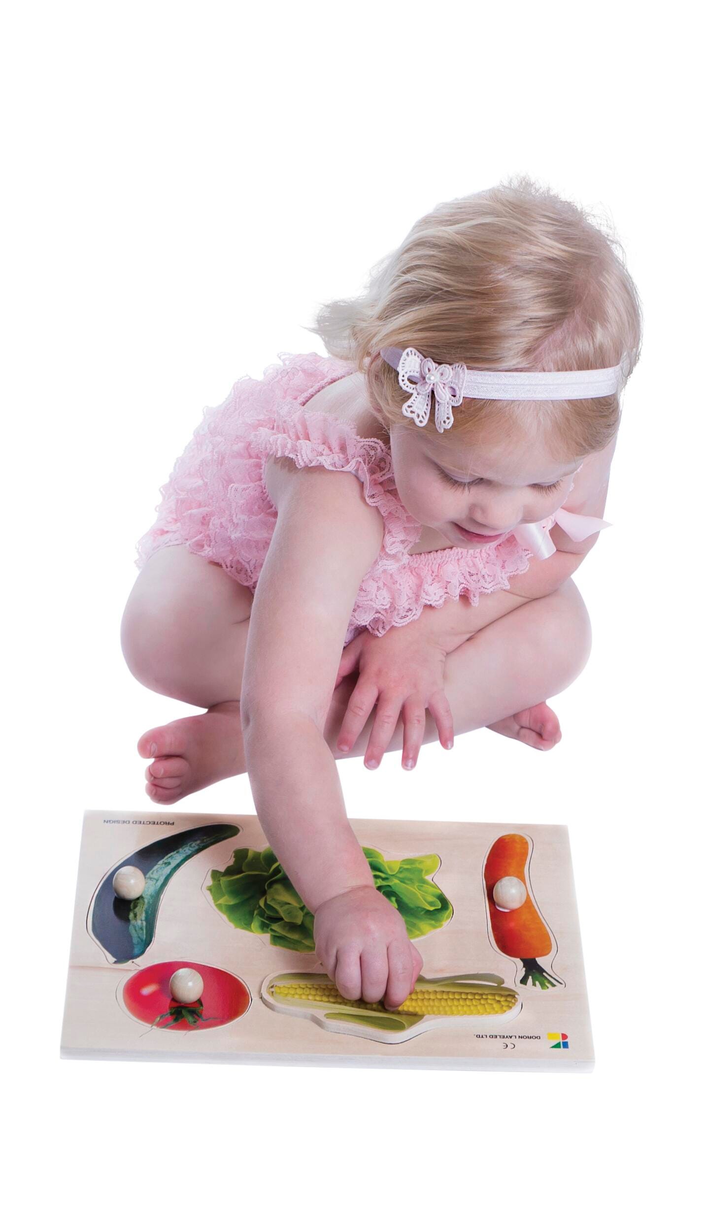 Bring the garden to your playroom with lifelike screen-printed vegetables on each puzzle piece. Each piece is affixed with an easy-to-grip knob for young hands developing fine motor skills. Perfect for ages two and older.