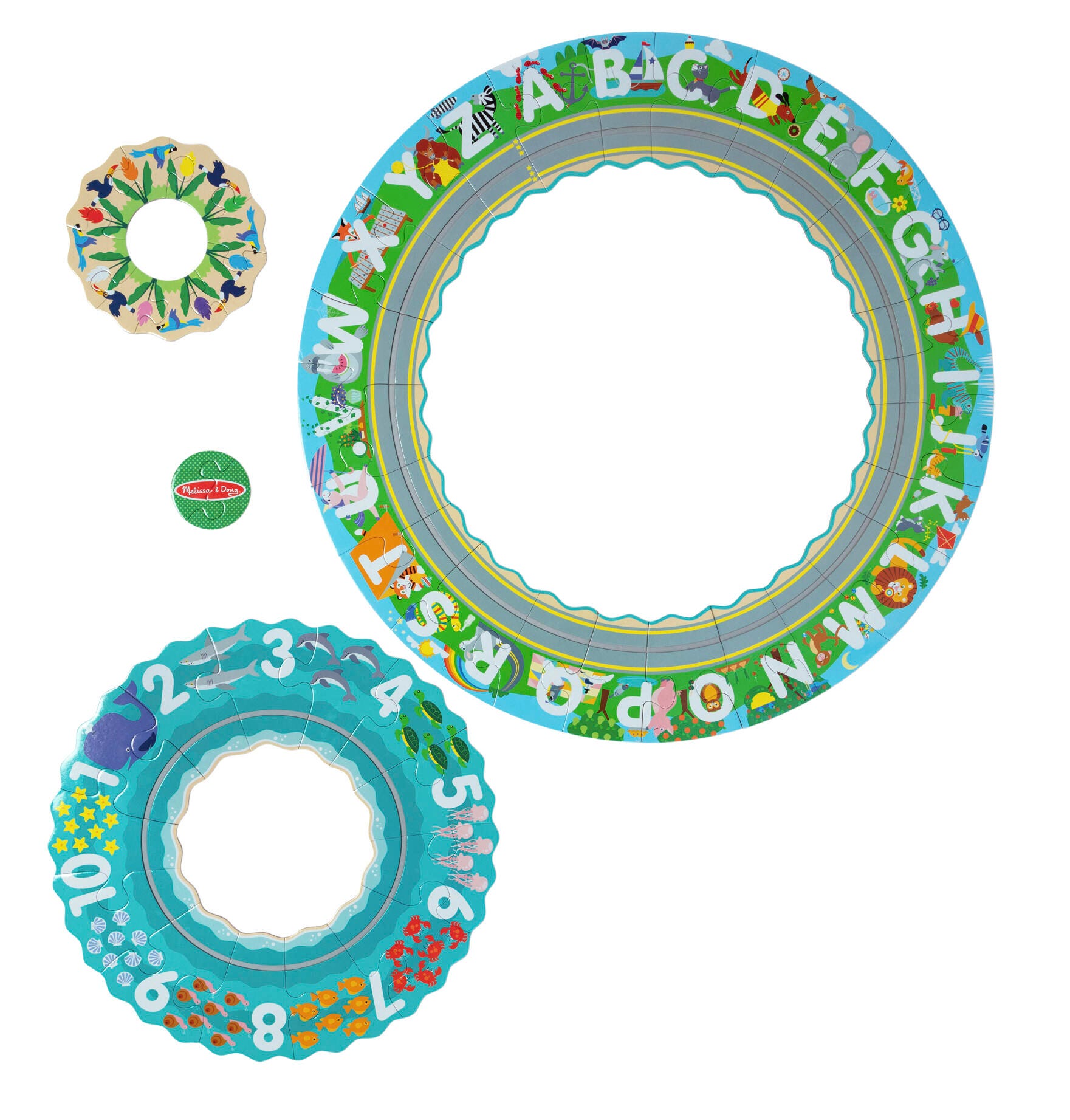 The 48-piece oceanside-themed cardboard jigsaw floor puzzle can be put together as three separate rings or as one complete circle. A groove in the inner ring lets the wind-up boat cruise past sea creatures and the numerals one through 10 to promote number recognition and counting. The outer ring has a track for the wind-up school bus to drive by the letters of the alphabet and pictures that start with each letter (in English). Sing along as the bus goes round and round! This fun and educational puzzle and vehicle play set measures 27 inches in diameter when complete, no batteries are required.