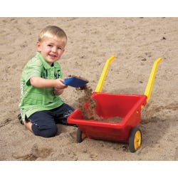 Your kiddos can load up on the labor fun with this Toy Wheelbarrow. Super tough plastic construction is built to withstand outdoor weather and hold up an astounding 50 kilograms (or 110 pounds) of material (or even a child!) for a fun ride with an adult steering. Two large, tilt-free, and silent rubber wheels provide a stable base when the wheelbarrow is filled with sand, dirt, or other materials. The foot behind each wheel prevents it from tipping backward. Long yellow handles make it easy to dump. Weight capacity is 110 pounds. Full wheelbarrow measures 27 L x 13 W x 13 H inches. For ages 2 and up.Features