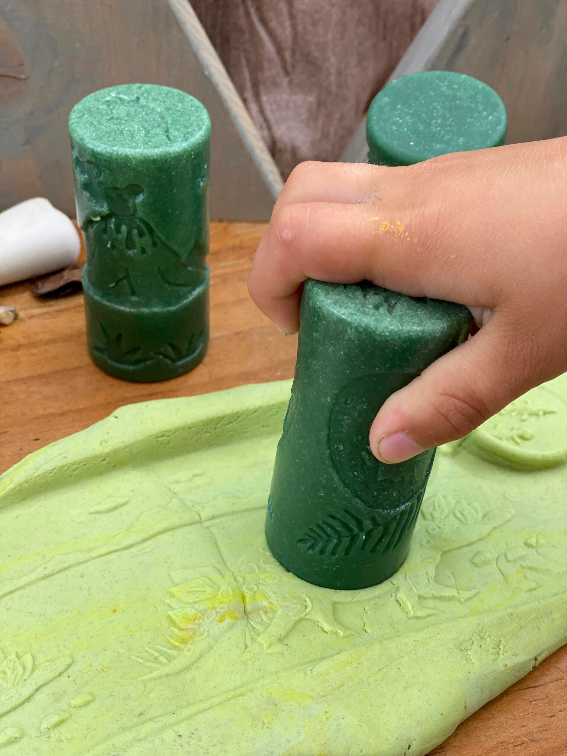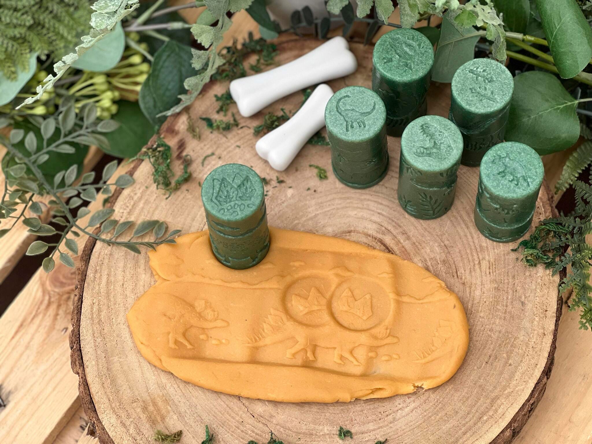 Inspire tactile play and STEM-inspired exploration with dinosaur stamps and rollers. These rollers offer a creative way for children to explore the historical natural world through tactile play, using stamps and rollers to explore these now-extinct creatures and their habitats. Roll into play dough or clay and stamp to create hands-on art projects that mimic a time since passed. From the easily identifiable Tyrannosaurus Rex to the less common coelacanth fish, children will have fun learning and identifying through stamping and rolling. Children can experiment using different amounts of pressure and rolling in different ways. Each roller measures approximately 3 L x 1-1/4 D inches. Perfect for children ages two and older.Features