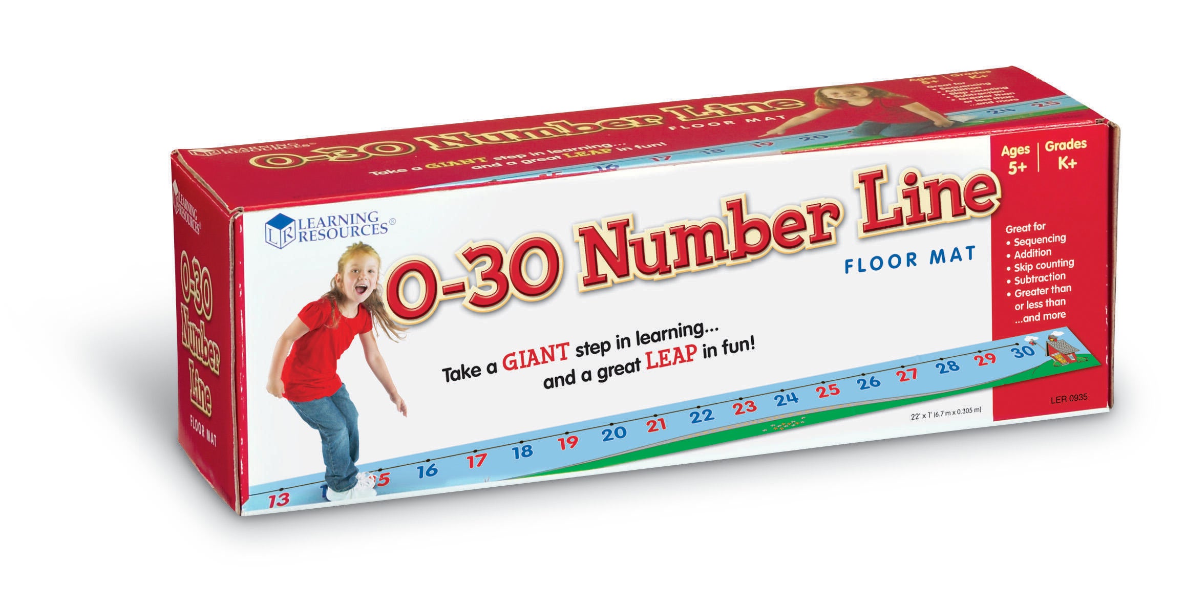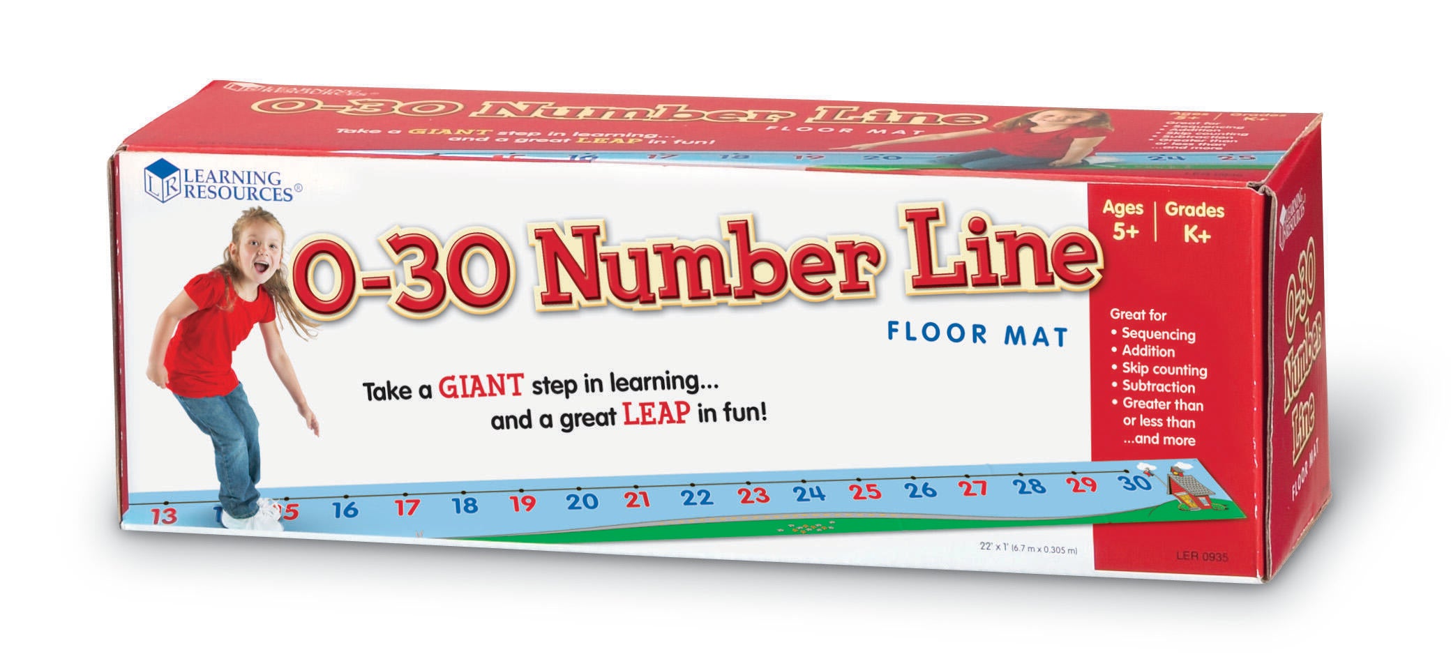 Learning Resources 0 to 30 Number Line Floor Mat helps reinforce number recognition, counting, addition, and subtraction with kinesthetic movement. Format features popular left-to-right visual representation and includes numerals from 0 to 30. Numerals are color-coded (blue evens, red odds, and black zero). Includes activity guide. Durable vinyl mat measures 22 x 1 feet. Best for ages 5 to 9.