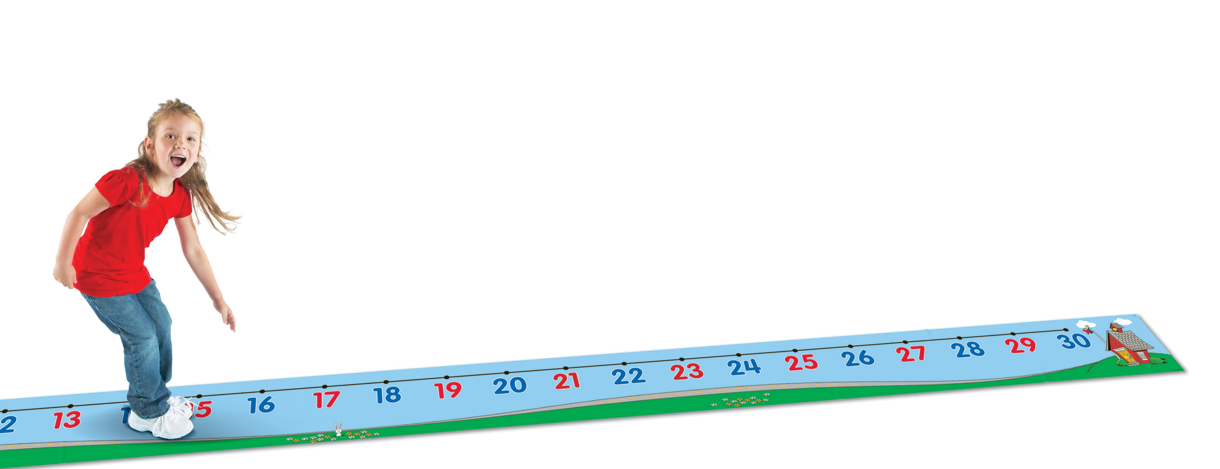 Long carpet numbered 1 to 30 helps young learners explore number sequence, identify multiples, and more