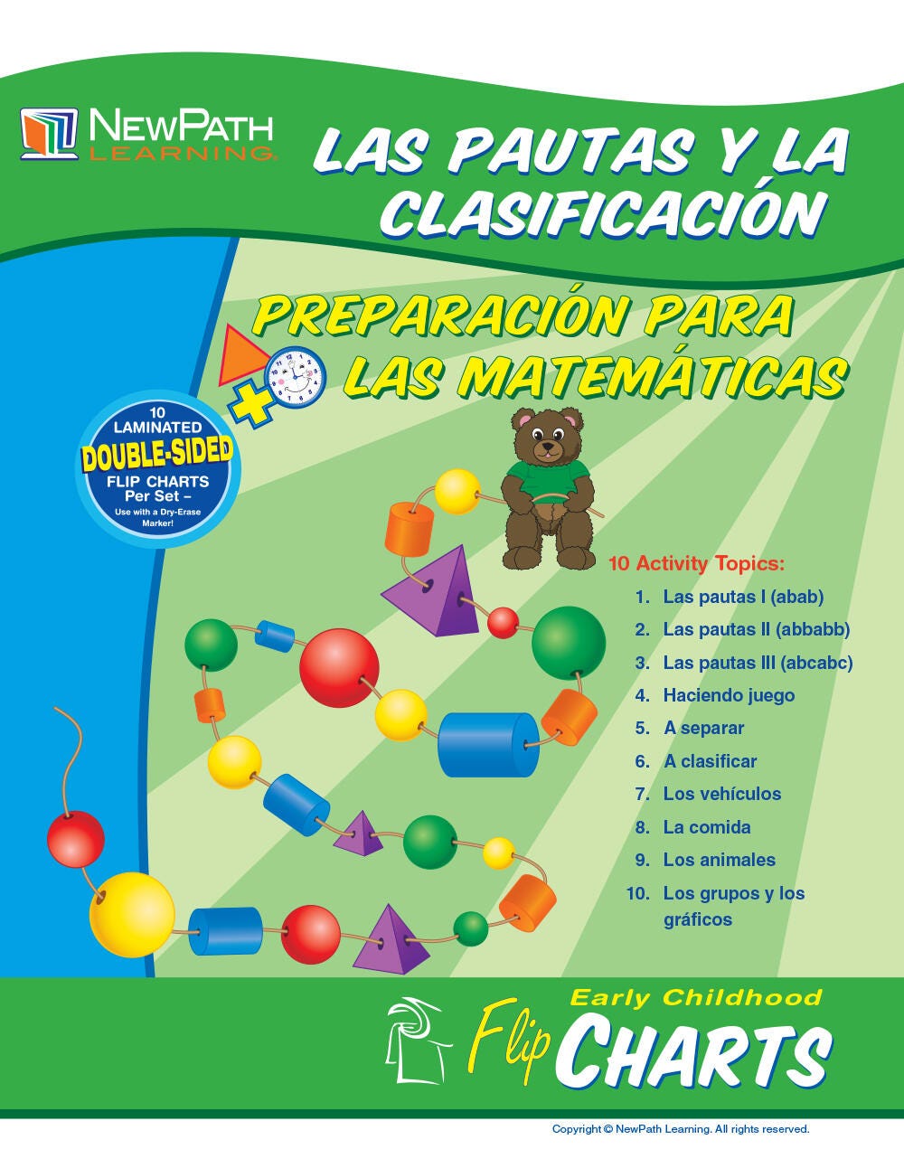 The Patterns & Sorting Spanish Language Flip Chart Set includes the following 10 double-sided, laminated charts: