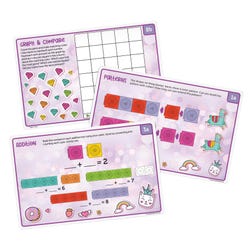 This magical math adventure is filled with hearts, stars, rainbows, and more! Kids learn addition, subtraction, patterning, and other kindergarten math skills with hands-on puzzles, games, and building challenges. Includes 15 double-sided write-and-wipe activity cards and 100 MathLink Cubes in 10 rainbow-themed colors.Features