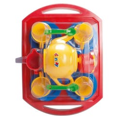 Perfect addition to the playhouse area for tea parties. Durable plastic construction for years of use. 18 piece set includes 15 inch serving tray and wipe-clean plastic tea service for 4 - cups, saucers, and teaspoons. Also includes tea pot, creamer, sugar bowl with lid and serving tray. Ages 2 and up. Standard Focus: role-play, one to one correspondence.Features