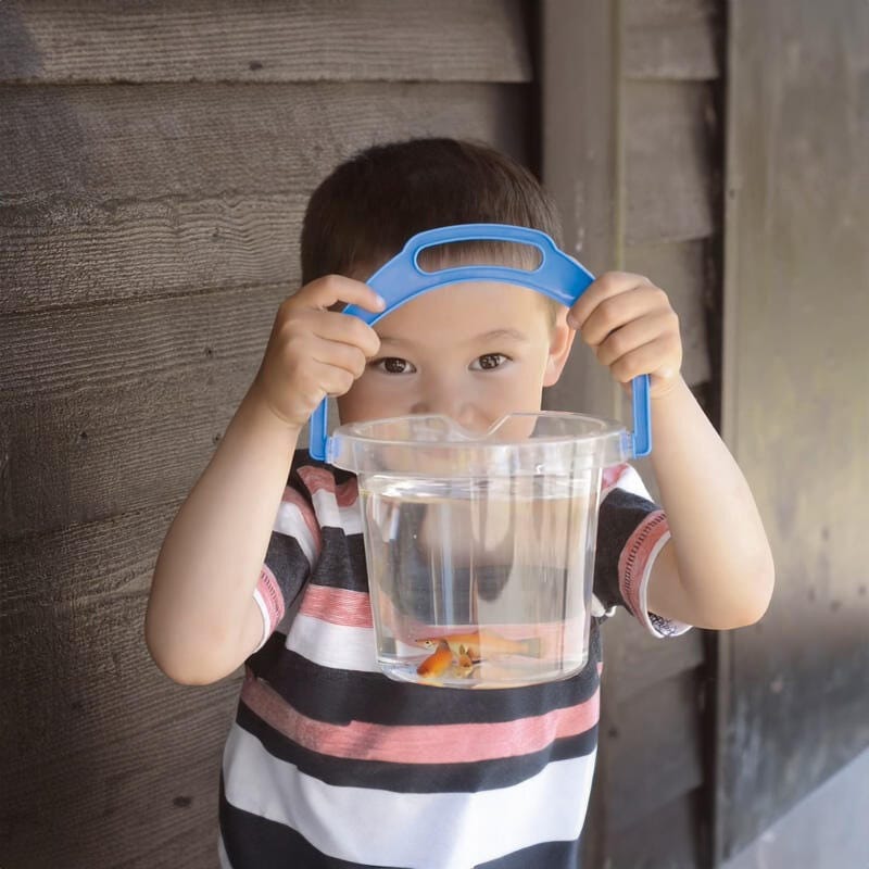 Shovel, fill, and pour sand/water like never before with this transparent bucket! Kids will finally be able to truly watch and learn the art and STEM skills of water and matter in live action while loading/unloading sand, water, or other water/nature critters (like crabs, insects, and more). Completely see-through, clear design also allows li'l ones to see how much (or how little) of sand or water is inside. . .perfect for learning volume or fractions! Plus a dipped spout "lip" ensures easy and controlled pouring, just like a water pitcher. A bright contrasting color (and slot grip for fingers) adds a pop of identifiable color at the beach, sandpit, or your indoor sand and water table. Measures 5 H inches total (with handle up) and holds 1 liter. Safe for ages 2 and up. Sold as 1 bucket only. Colors and designs may vary.Features